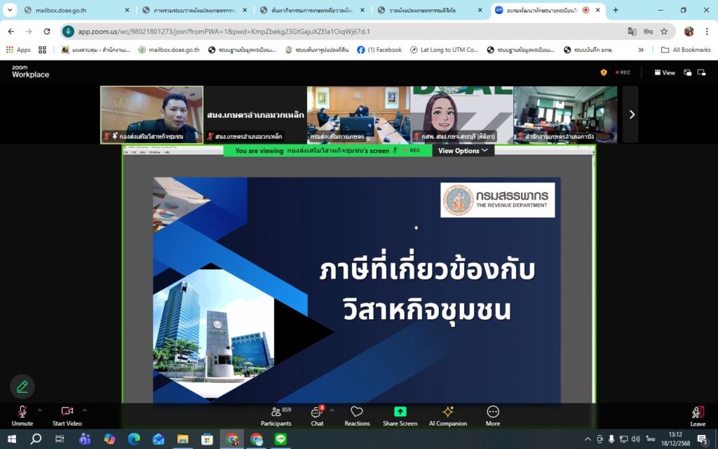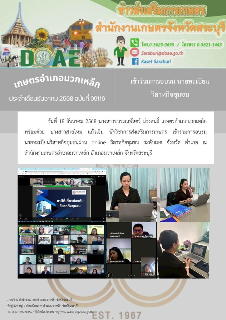 วันที่ 18 ธันวาคม 2568 นางสาวปวรรณพัสตร์ ม่วงสนธิ์ เกษตรอำเภอมวกเหล็ก พร้อมด้วย นางสาวสายไหม แก้วเจิม นักวิชาการส่งเสริมการเกษตร เข้าร่วมการอบรม นายทะเบียนวิสาหกิจชุมชนผ่าน online วิสาหกิจชุมชน ระดับเขต จังหวัด อำเภอ ณ สำนักงานเกษตรอำเภอมวกเหล็ก อำเภอมวกเหล็ก จังหวัดสระบุรี