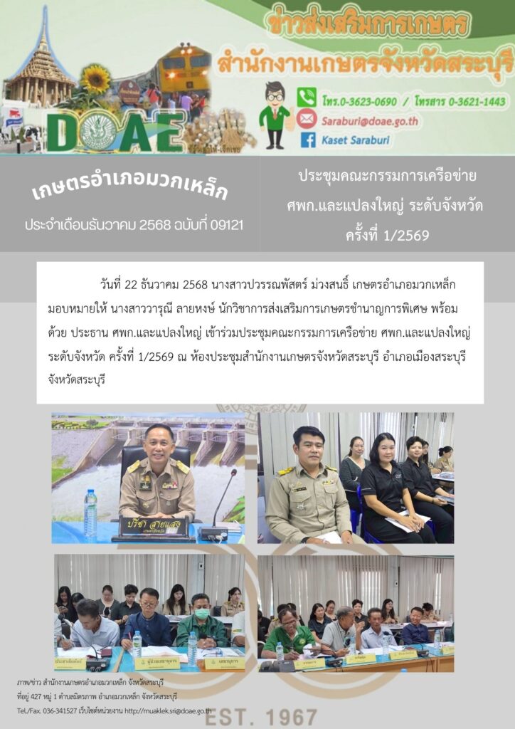 วันที่ 22 ธันวาคม 2568 นางสาวปวรรณพัสตร์ ม่วงสนธิ์ เกษตรอำเภอมวกเหล็ก มอบหมายให้ นางสาววารุณี ลายหงษ์ นักวิชาการส่งเสริมการเกษตรชำนาญการพิเศษ พร้อมด้วย ประธาน ศพก.และแปลงใหญ่่ เข้าร่วมประชุมคณะกรรมการเครือข่าย ศพก.และแปลงใหญ่ ระดับจังหวัด ครั้งที่ 1/2569 ณ ห้องประชุมสำนักงานเกษตรจังหวัดสระบุรี อำเภอเมืองสระบุรี จังหวัดสระบุรี