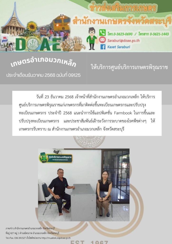 วันที่ 23 ธันวาคม 2568 เจ้าหน้าที่สำนักงานเกษตรอำเภอมวกเหล็ก ให้บริการศูนย์บริการเกษตรพิรุณราชแก่เกษตรกรที่มาติดต่อขึ้นทะเบียนเกษตรกรและปรับปรุงทะเบียนเกษตรกร ประจำปี 2568 แนะนำการใช้แอปพิเคชั่น Farmbook ในการขึ้นและปรับปรุงทะเบียนเกษตรกร และประชาสัมพันธ์เฝ้าระวังการระบาดของโรคพืชต่างๆ ให้เกษตรกรรับทราบ ณ สำนักงานเกษตรอำเภอมวกเหล็ก จังหวัดสระบุรี