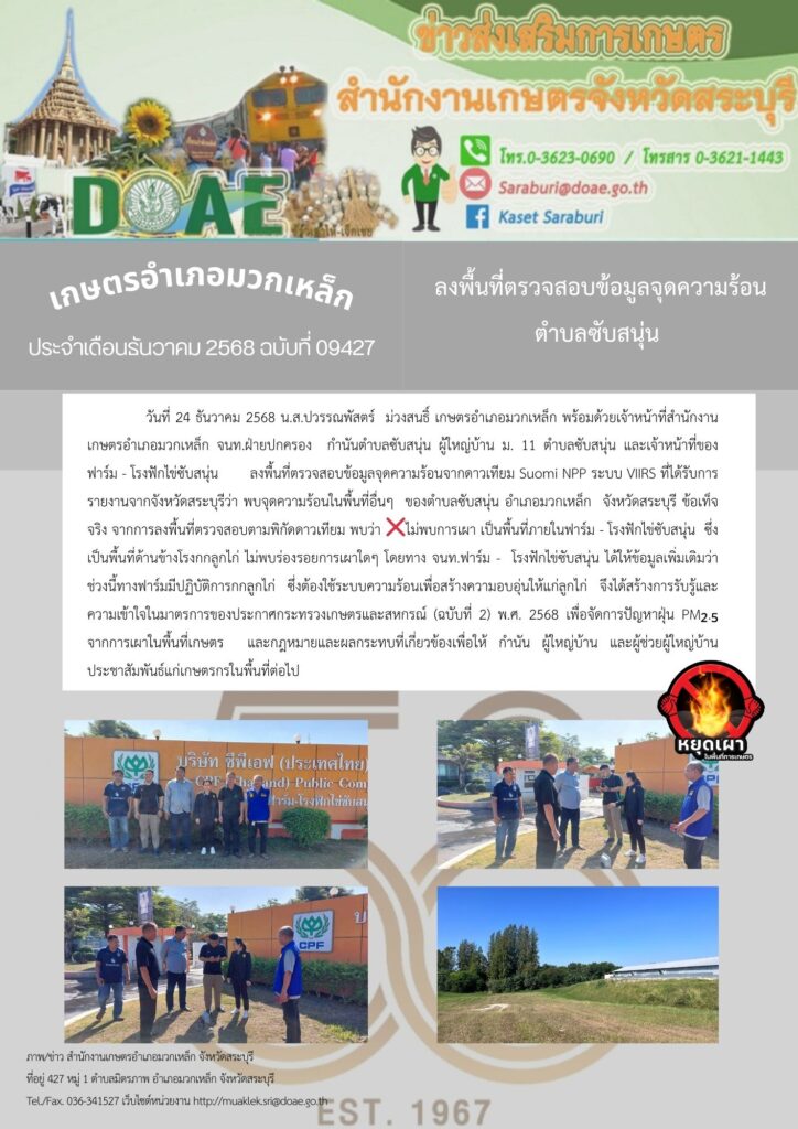 วันที่ 24 ธันวาคม 2568 น.ส.ปวรรณพัสตร์ ม่วงสนธิ์ เกษตรอำเภอมวกเหล็ก พร้อมด้วยเจ้าหน้าที่สำนักงานเกษตรอำเภอมวกเหล็ก จนท.ฝ่ายปกครอง กำนันตำบลซับสนุ่น ผู้ใหญ่บ้าน ม. 11 ตำบลซับสนุ่น และเจ้าหน้าที่ของฟาร์ม – โรงฟักไข่ซับสนุ่น ลงพื้นที่ตรวจสอบข้อมูลจุดความร้อนจากดาวเทียม Suomi NPP ระบบ VIIRS ที่ได้รับการรายงานจากจังหวัดสระบุรีว่า พบจุดความร้อนในพื้นที่อื่นๆ ของตำบลซับสนุ่น อำเภอมวกเหล็ก จังหวัดสระบุรี ข้อเท็จจริง จากการลงพื้นที่ตรวจสอบตามพิกัดดาวเทียม พบว่า ❌️ไม่พบการเผา เป็นพื้นที่ภายในฟาร์ม – โรงฟักไข่ซับสนุ่น ซึ่งเป็นพื้นที่ด้านข้างโรงกกลูกไก่ ไม่พบร่องรอยการเผาใดๆ โดยทาง จนท.ฟาร์ม – โรงฟักไข่ซับสนุ่น ได้ให้ข้อมูลเพิ่มเติมว่า ช่วงนี้ทางฟาร์มมีปฏิบัติการกกลูกไก่ ซึ่งต้องใช้ระบบความร้อนเพื่อสร้างความอบอุ่นให้แก่ลูกไก่ จึงได้สร้างการรับรู้และความเข้าใจในมาตรการของประกาศกระทรวงเกษตรและสหกรณ์ (ฉบับที่ 2) พ.ศ. 2568 เพื่อจัดการปัญหาฝุ่น PM₂.₅ จากการเผาในพื้นที่เกษตร และกฎหมายและผลกระทบที่เกี่ยวข้องเพื่อให้ กำนัน ผู้ใหญ่บ้าน และผู้ช่วยผู้ใหญ่บ้าน ประชาสัมพันธ์แก่เกษตรกรในพื้นที่ต่อไป