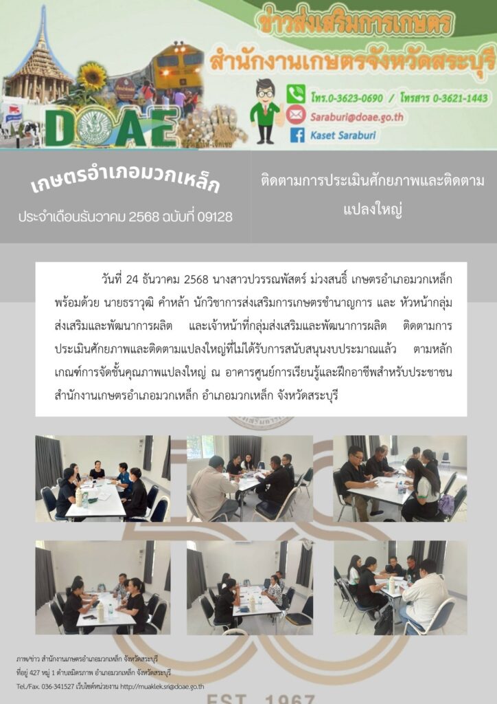 วันที่ 24 ธันวาคม 2568 นางสาวปวรรณพัสตร์ ม่วงสนธิ์ เกษตรอำเภอมวกเหล็ก พร้อมด้วย นายธราวุฒิ คำหล้า นักวิชาการส่งเสริมการเกษตรชำนาญการ และ หัวหน้ากลุ่มส่งเสริมและพัฒนาการผลิต และเจ้าหน้าที่กลุ่มส่งเสริมและพัฒนาการผลิต ติดตามการประเมินศักยภาพและติดตามแปลงใหญ่ที่ไม่ได้รับการสนับสนุนงบประมาณแล้ว ตามหลักเกณฑ์การจัดชั้นคุณภาพแปลงใหญ่ ณ อาคารศูนย์การเรียนรู้และฝึกอาชีพสำหรับประชาชน สำนักงานเกษตรอำเภอมวกเหล็ก อำเภอมวกเหล็ก จังหวัดสระบุรี