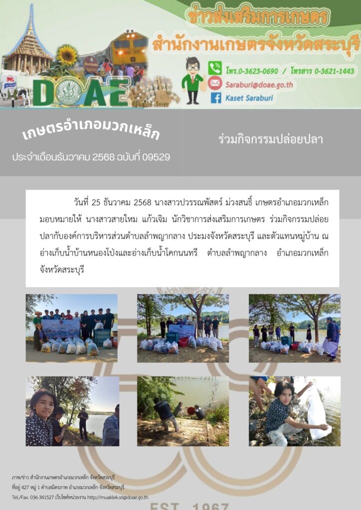 วันที่ 25 ธันวาคม 2568 นางสาวปวรรณพัสตร์ ม่วงสนธิ์ เกษตรอำเภอมวกเหล็ก มอบหมายให้ นางสาวสายใหม แก้วเจิม นักวิชาการส่งเสริมการเกษตร ร่วมกิจกรรมปล่อยปลากับองค์การบริหารส่วนตำบลลำพญากลาง ประมงจังหวัดสระบุรี และตัวแทนหมู่บ้าน ณ อ่างเก็บน้ำบ้านหนองโป่งและอ่างเก็บน้ำโคกนนทรี ตำบลลำพญากลาง อำเภอมวกเหล็ก จังหวัดสระบุรี