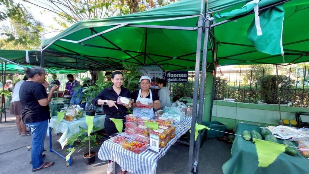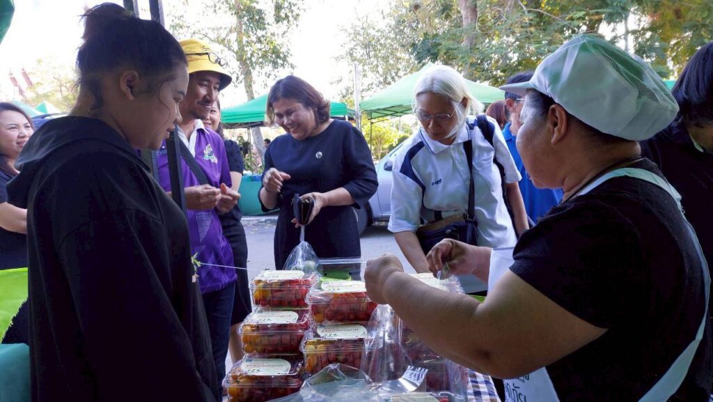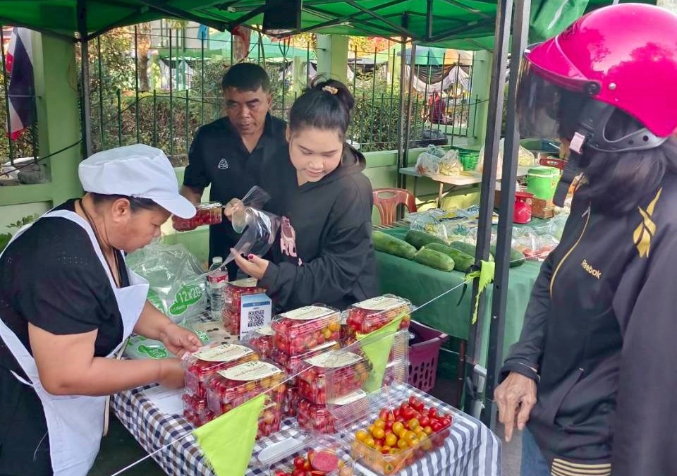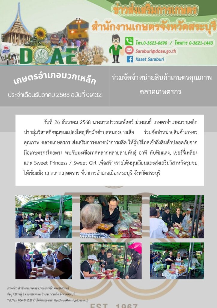 วันที่ 26 ธันวาคม 2568 นางสาวปวรรณพัสตร์ ม่วงสนธิ์ เกษตรอำเภอมวกเหล็ก นำกลุ่มวิสาหกิจชุมชนแปลงใหญ่พืชผักตำบลหนองย่างเสือ ร่วมจัดจำหน่ายสินค้าเกษตรคุณภาพ ตลาดเกษตรกร ส่งเสริมการตลาดนำการผลิต ให้ผู้บริโภคเข้าถึงสินค้าปลอดภัยจากมือเกษตรกรโดยตรง พบกับมะเขือเทศหลากหลายสายพันธุ์ อาทิ ทับทิมแดง, เชอร์รี่เหลือง และ Sweet Princess / Sweet Girl เพื่อสร้างรายได้หมุนเวียนและส่งเสริมวิสาหกิจชุมชนให้เข้มแข็ง ณ ตลาดเกษตรกร ที่ว่าการอำเภอเมืองสระบุรี จังหวัดสระบุรี