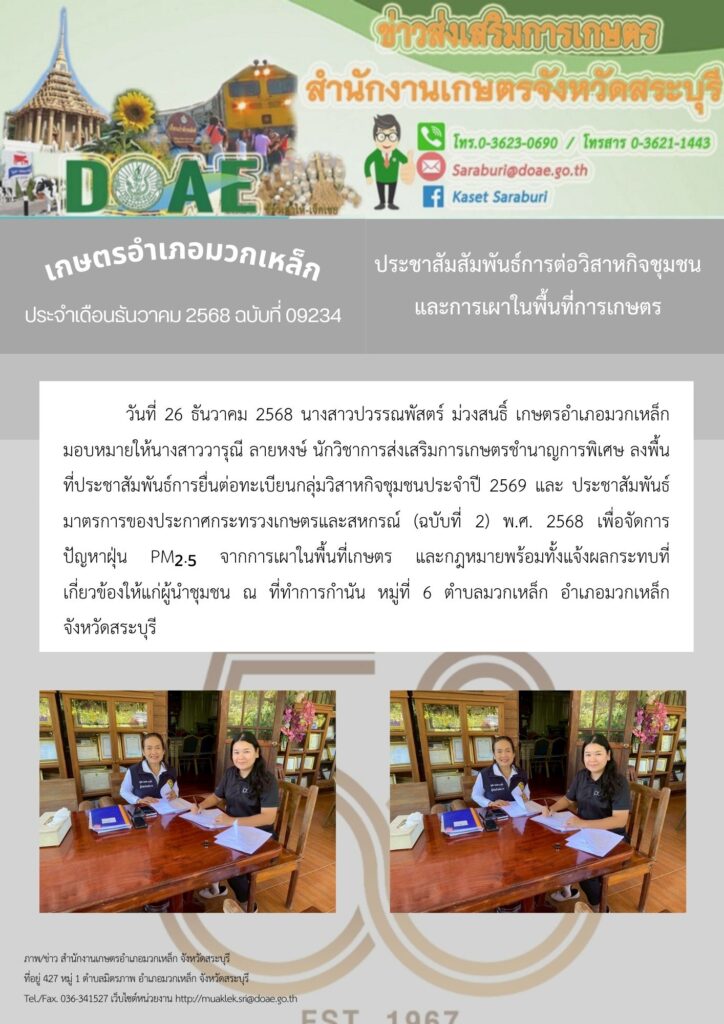 วันที่ 26 ธันวาคม 2568 นางสาวปวรรณพัสตร์ ม่วงสนธิ์ เกษตรอำเภอมวกเหล็ก มอบหมายให้นางสาววารุณี ลายหงษ์ นักวิชาการส่งเสริมการเกษตรชำนาญการพิเศษ ลงพื้นที่ประชาสัมพันธ์การยื่นต่อทะเบียนกลุ่มวิสาหกิจชุมชนประจำปี 2569 และ ประชาสัมพันธ์ มาตรการของประกาศกระทรวงเกษตรและสหกรณ์ (ฉบับที่ 2) พ.ศ. 2568 เพื่อจัดการปัญหาฝุ่น PM₂.₅ จากการเผาในพื้นที่เกษตร และกฎหมายพร้อมทั้งแจ้งผลกระทบที่เกี่ยวข้องให้แก่ผู้นำชุมชน ณ ที่ทำการกำนัน หมู่ที่ 6 ตำบลมวกเหล็ก อำเภอมวกเหล็ก จังหวัดสระบุรี
