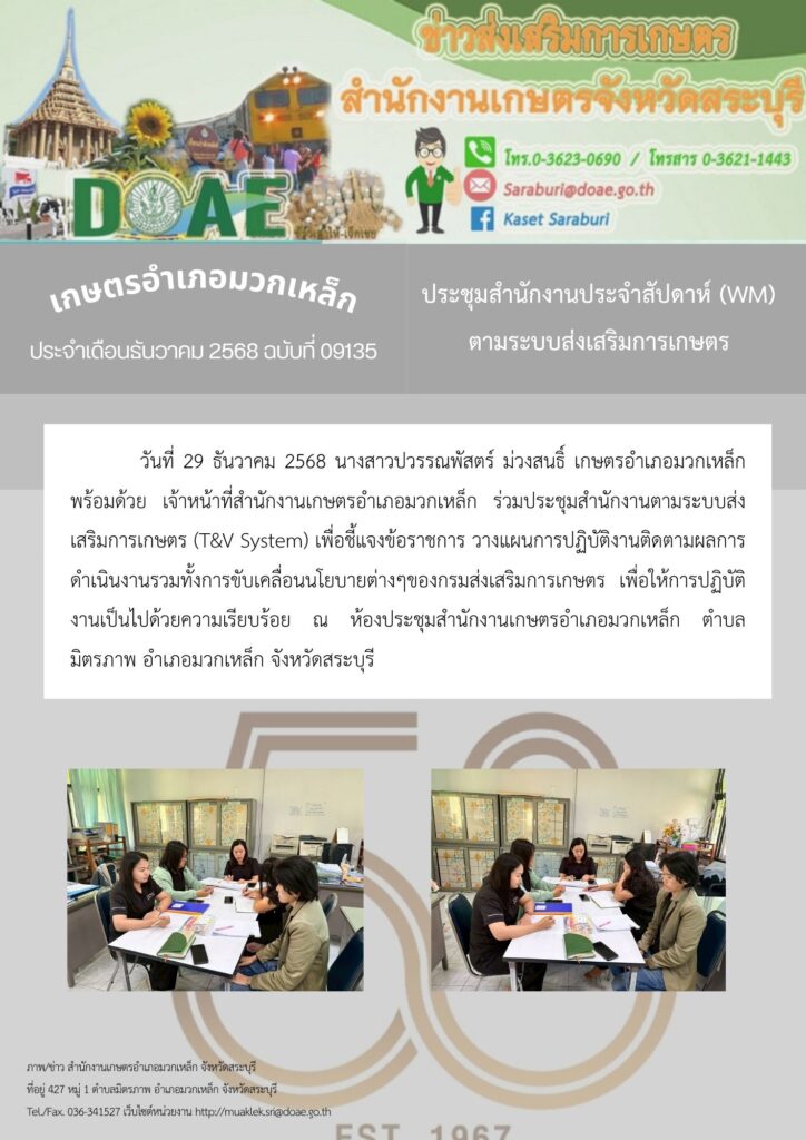 วันที่ 29 ธันวาคม 2568 นางสาวปวรรณพัสตร์ ม่วงสนธิ์ เกษตรอำเภอมวกเหล็ก พร้อมด้วย เจ้าหน้าที่สำนักงานเกษตรอำเภอมวกเหล็ก ร่วมประชุมสำนักงานตามระบบส่งเสริมการเกษตร (T&V System) เพื่อชี้แจงข้อราชการ วางแผนการปฏิบัติงานติดตามผลการดำเนินงานรวมทั้งการขับเคลื่อนนโยบายต่างๆของกรมส่งเสริมการเกษตร เพื่อให้การปฏิบัติงานเป็นไปด้วยความเรียบร้อย ณ ห้องประชุมสำนักงานเกษตรอำเภอมวกเหล็ก ตำบลมิตรภาพ อำเภอมวกเหล็ก จังหวัดสระบุรี