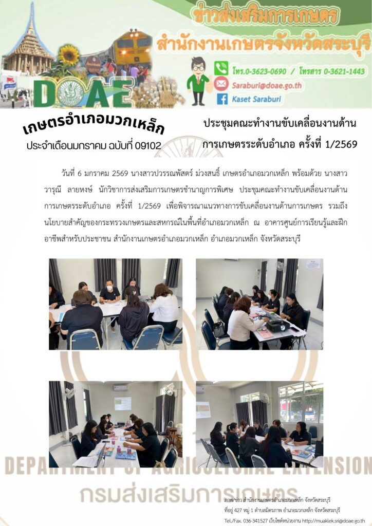 วันที่ 6 มกราคม 2569 นางสาวปวรรณพัสตร์ ม่วงสนธิ์ เกษตรอำเภอมวกเหล็ก พร้อมด้วย นางสาววารุณี ลายหงษ์ นักวิชาการส่งเสริมการเกษตรชำนาญการพิเศษ ประชุมคณะทำงานขับเคลื่อนงานด้านการเกษตรระดับอำเภอ ครั้งที่ 1/2569 เพื่อพิจารณาแนวทางการขับเคลื่อนงานด้านการเกษตร รวมถึงนโยบายสำคัญของกระทรวงเกษตรและสหกรณ์ในพื้นที่อำเภอมวกเหล็ก ณ อาคารศูนย์การเรียนรู้และฝึกอาชีพสำหรับประชาชน สำนักงานเกษตรอำเภอมวกเหล็ก อำเภอมวกเหล็ก จังหวัดสระบุรี