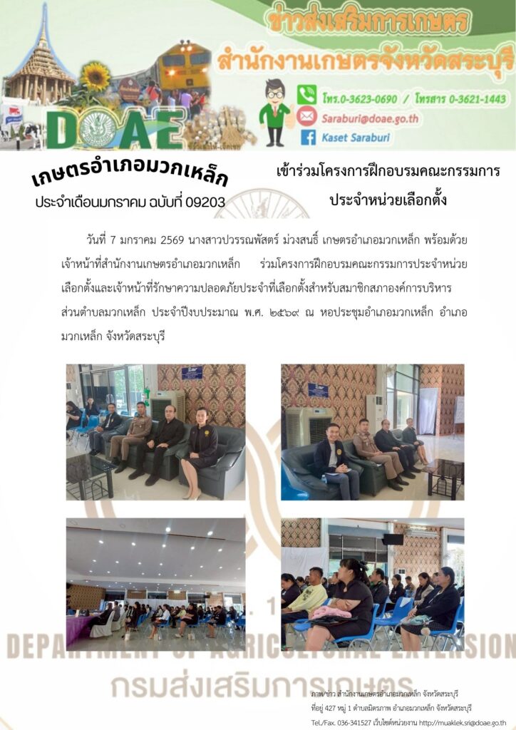 วันที่ 7 มกราคม 2569 นางสาวปวรรณพัสตร์ ม่วงสนธิ์ เกษตรอำเภอมวกเหล็ก พร้อมด้วย เจ้าหน้าที่สำนักงานเกษตรอำเภอมวกเหล็ก ร่วมโครงการฝึกอบรมคณะกรรมการประจำหน่วยเลือกตั้งและเจ้าหน้าที่รักษาความปลอดภัยประจำที่เลือกตั้งสำหรับสมาชิกสภาองค์การบริหารส่วนตำบลมวกเหล็ก ประจำปีงบประมาณ พ.ศ. ๒๕๖๙ ณ หอประชุมอำเภอมวกเหล็ก อำเภอมวกเหล็ก จังหวัดสระบุรี