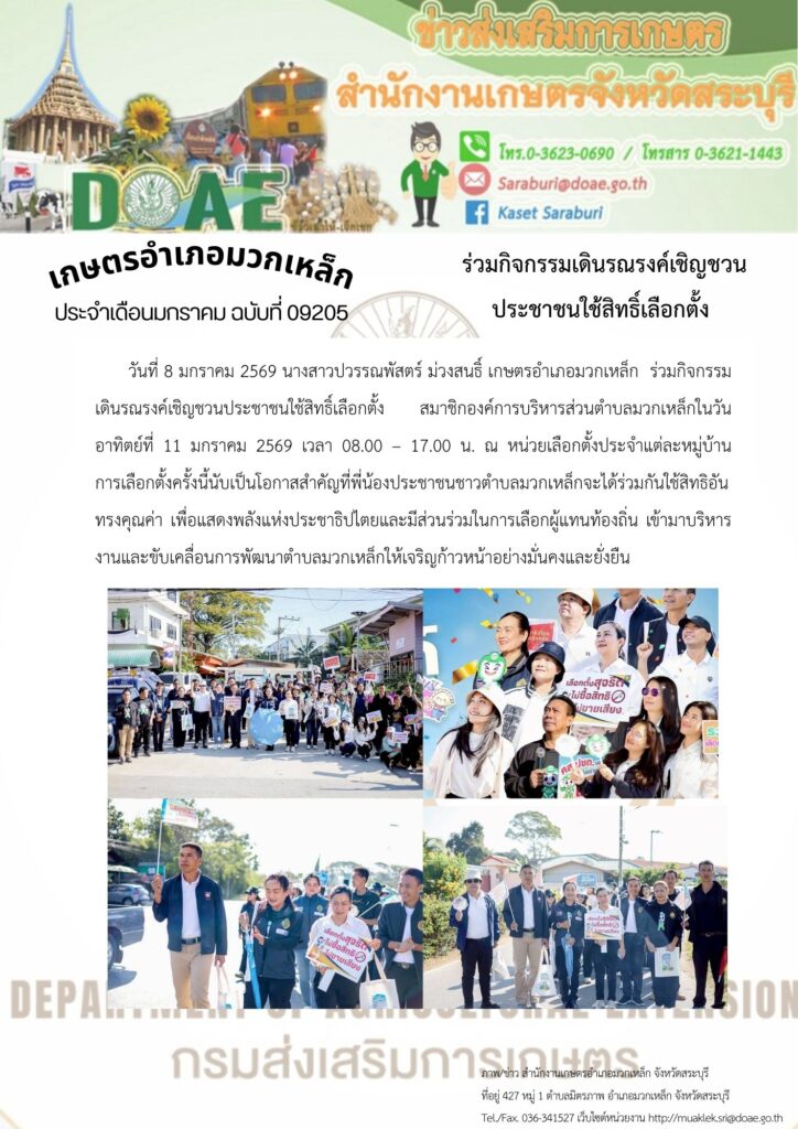 วันที่ 8 มกราคม 2569 นางสาวปวรรณพัสตร์ ม่วงสนธิ์ เกษตรอำเภอมวกเหล็ก ร่วมกิจกรรมเดินรณรงค์เชิญชวนประชาชนใช้สิทธิ์เลือกตั้ง สมาชิกองค์การบริหารส่วนตำบลมวกเหล็กในวันอาทิตย์ที่ 11 มกราคม 2569 เวลา 08.00 – 17.00 น. ณ หน่วยเลือกตั้งประจำแต่ละหมู่บ้าน การเลือกตั้งครั้งนี้นับเป็นโอกาสสำคัญที่พี่น้องประชาชนชาวตำบลมวกเหล็กจะได้ร่วมกันใช้สิทธิอันทรงคุณค่า เพื่อแสดงพลังแห่งประชาธิปไตยและมีส่วนร่วมในการเลือกผู้แทนท้องถิ่น เข้ามาบริหารงานและขับเคลื่อนการพัฒนาตำบลมวกเหล็กให้เจริญก้าวหน้าอย่างมั่นคงและยั่งยืน