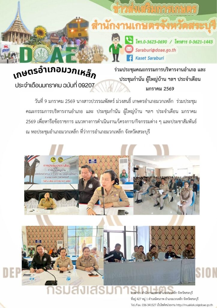 วันที่ 9 มกราคม 2569 นางสาวปวรรณพัสตร์ ม่วงสนธิ์ เกษตรอำเภอมวกเหล็ก ร่วมประชุมคณะกรรมการบริหารงานอำเภอ และ ประชุมกำนัน ผู้ใหญ่บ้าน ฯลฯ ประจำเดือน มกราคม 2569 เพื่อหารือข้อราชการ แนวทางการดำเนินงาน/โครงการ/กิจกรรมต่าง ๆ และประชาสัมพันธ์ ณ หอประชุมอำเภอมวกเหล็ก ที่ว่าการอำเภอมวกเหล็ก จังหวัดสระบุรี