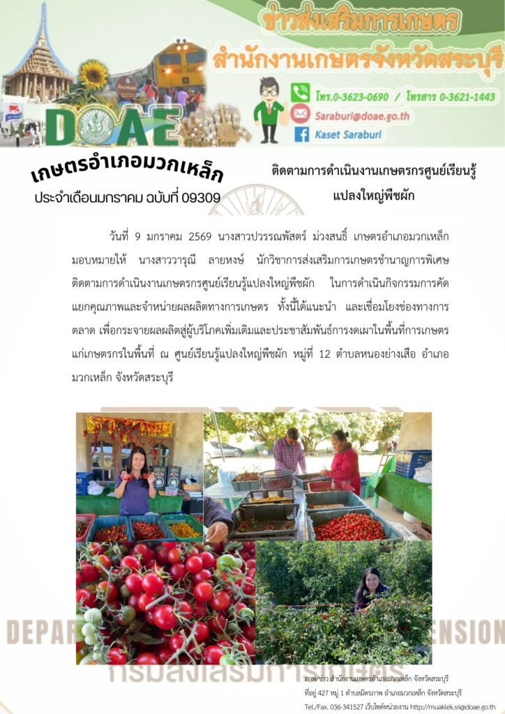 วันที่ 9 มกราคม 2569 นางสาวปวรรณพัสตร์ ม่วงสนธิ์ เกษตรอำเภอมวกเหล็ก มอบหมายให้ นางสาววารุณี ลายหงษ์ นักวิชาการส่งเสริมการเกษตรชำนาญการพิเศษ ติดตามการดำเนินงานเกษตรกรศูนย์เรียนรู้แปลงใหญ่พืชผัก ในการดำเนินกิจกรรมการคัดแยกคุณภาพและจำหน่ายผลผลิตทางการเกษตร ทั้งนี้ได้แนะนำ และเชื่อมโยงช่องทางการตลาด เพื่อกระจายผลผลิตสู่ผู้บริโภคเพิ่มเติมและประชาสัมพันธ์การงดเผาในพื้นที่การเกษตรแก่เกษตรกรในพื้นที่ ณ ศูนย์เรียนรู้แปลงใหญ่พืชผัก หมู่ที่ 12 ตำบลหนองย่างเสือ อำเภอมวกเหล็ก จังหวัดสระบุรี
