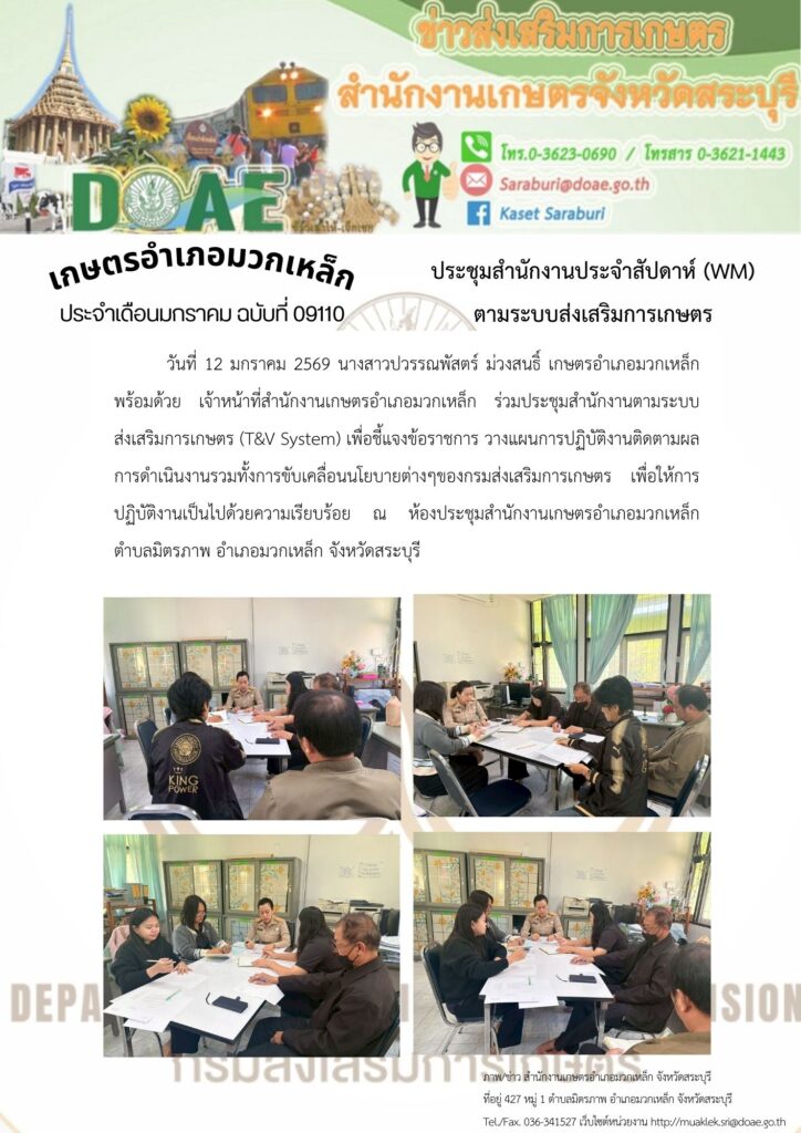 วันที่ 12 มกราคม 2569 นางสาวปวรรณพัสตร์ ม่วงสนธิ์ เกษตรอำเภอมวกเหล็ก พร้อมด้วย เจ้าหน้าที่สำนักงานเกษตรอำเภอมวกเหล็ก ร่วมประชุมสำนักงานตามระบบ ส่งเสริมการเกษตร (T&V System) เพื่อชี้แจงข้อราชการ วางแผนการปฏิบัติงานติดตามผลการดำเนินงานรวมทั้งการขับเคลื่อนนโยบายต่างๆของกรมส่งเสริมการเกษตร เพื่อให้การปฏิบัติงานเป็นไปด้วยความเรียบร้อย ณ ห้องประชุมสำนักงานเกษตรอำเภอมวกเหล็ก ตำบลมิตรภาพ อำเภอมวกเหล็ก จังหวัดสระบุรี