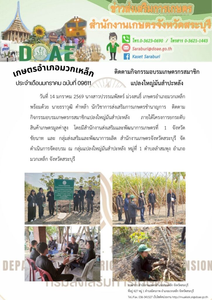 วันที่ 14 มกราคม 2569 นางสาวปวรรณพัสตร์ ม่วงสนธิ์ เกษตรอำเภอมวกเหล็ก พร้อมด้วย นายธราวุฒิ คำหล้า นักวิชาการส่งเสริมการเกษตรชำนาญการ ติดตามกิจกรรมอบรมเกษตรกรสมาชิกแปลงใหญ่มันสำปะหลัง ภายใต้โครงการยกระดับสินค้าเกษตรมูลค่าสูง โดยมีสำนักงานส่งเสริมและพัฒนาการเกษตรที่ 1 จังหวัดชัยนาท และ กลุ่มส่งเสริมและพัฒนาการผลิต สำนักงานเกษตรจังหวัดสระบุรี จัดดำเนินการจัดอบรม ณ กลุ่มแปลงใหญ่มันสำปะหลัง หมู่ที่ 1 ตำบลลำสมพุง อำเภอมวกเหล็ก จังหวัดสระบุรี