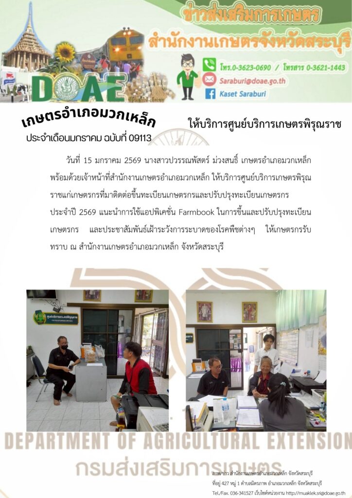 วันที่ 15 มกราคม 2569 นางสาวปวรรณพัสตร์ ม่วงสนธิ์ เกษตรอำเภอมวกเหล็ก พร้อมด้วยเจ้าหน้าที่สำนักงานเกษตรอำเภอมวกเหล็ก ให้บริการศูนย์บริการเกษตรพิรุณราชแก่เกษตรกรที่มาติดต่อขึ้นทะเบียนเกษตรกรและปรับปรุงทะเบียนเกษตรกร ประจำปี 2569 แนะนำการใช้แอปพิเคชั่น Farmbook ในการขึ้นและปรับปรุงทะเบียนเกษตรกร และประชาสัมพันธ์เฝ้าระวังการระบาดของโรคพืชต่างๆ ให้เกษตรกรรับทราบ ณ สำนักงานเกษตรอำเภอมวกเหล็ก จังหวัดสระบุรี