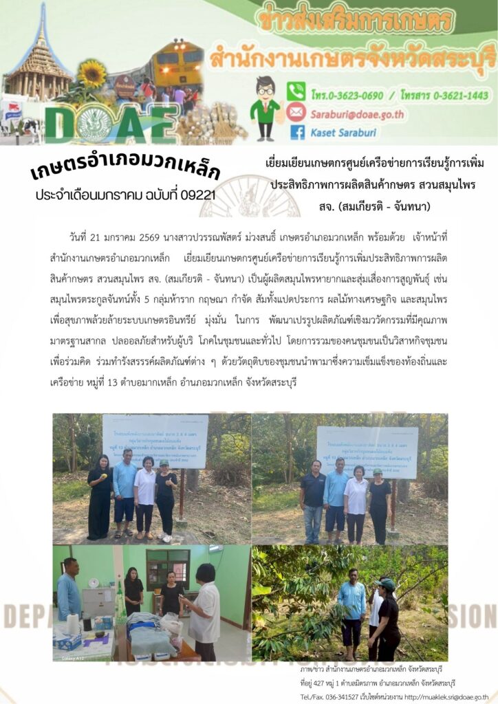 วันที่ 21 มกราคม 2569 นางสาวปวรรณพัสตร์ ม่วงสนธิ์ เกษตรอำเภอมวกเหล็ก พร้อมด้วย เจ้าหน้าที่สำนักงานเกษตรอำเภอมวกเหล็ก เยี่ยมเยียนเกษตกรศูนย์เครือข่ายการเรียนรู้การเพิ่มประสิทธิภาพการผลิตสินค้ากษตร สวนสมุนไพร สจ. (สมเกียรติ – จันทนา) เป็นผู้ผลิตสมุนไพรหายากและสุ่มเสื่องการสูญพันธุ์ เช่น สมุนไพรตระกูลจันทน์ทั้ง 5 กลุ่มห้าราก กฤษณา กำจัด สัมทั้งแปดประการ ผลไม้ทางเศรษฐกิจ และสมุนไพรเพื่อสุขภาพล้วยล้ายระบบเกษตรอินทรีย์ มุ่งมั่น ในการ พัฒนาเปรรูปผลิตภัณฑ์เชิงมววัดกรรมที่มีคุณภาพมาตรฐานสากล ปลออลภัยสำหรับผู้บริ โภคในชุมชนและทั่วไป โดยการรวมของคนชุมขนเป็นวิสาหกิจชุมชน เพื่อร่วมคิด ร่วมทำรังสรรรค์ผลิตภัณฑ์ต่าง ๆ ด้วยวัตถุติบของชุมชนนำพามาซึ่งความเข็มแข็งของท้องถิ่นและเครือข่าย หมู่ที่ 13 ตำบอมากเหล็ก อำนภอมวกเหล็ก จังหวัดสระบุรี