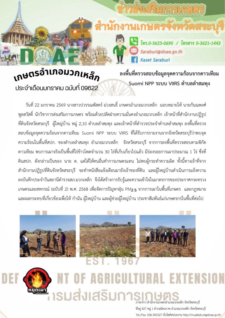 วันที่ 22 มกราคม 2569 นางสาวปวรรณพัสตร์ ม่วงสนธิ์ เกษตรอำเภอมวกเหล็ก มอบหมายให้ นายกันณพงศ์ พูลสวัสดิ์ นักวิชาการส่งเสริมการเกษตร พร้อมด้วยปลัดฝ่ายความมั่นคงอำเภอมวกเหล็ก เจ้าหน้าที่สำนักงานปฏิรูปที่ดินจังหวัดสระบุรี ผู้ใหญ่บ้าน หมู่ 2,10 ตำบลลำสมพุง และเจ้าหน้าที่ตำรวจประจำตำบลลำสมพุง ลงพื้นที่ตรวจสอบข้อมูลจุดความร้อนจากดาวเทียม Suomi NPP ระบบ VIIRS ที่ได้รับการรายงานจากจังหวัดสระบุรีว่าพบจุดความร้อนในพื้นที่สปก. ของตำบลลำสมพุง อำเภอมวกเหล็ก จังหวัดสระบุรี จากการลงพื้นที่ตรวจสอบตามพิกัดดาวเทียม พบการเผาจริงเป็นพื้นที่ไร่ข้าวโพดจำนวน 30 ไร่ที่เก็บเกี่ยวไปแล้ว มีร่องรอยการเผาประมาณ 1 ไร่ ซึ่งที่ดินสปก. ดังกล่าวเป็นของ นาย ต. แต่ได้ให้คนอื่นทำการเกษตรแทน ไม่พบผู้กระทำความผิด ทั้งนี้ทางเจ้าที่จากสำนักงานปฏิรูปที่ดินจังหวัดสระบุรี จะทำหนังสือแจ้งเตือนมายังเจ้าของที่ดิน และผู้ใหญ่บ้านดำเนินการแจ้งความ ลงบันทึกประจำวันสถานีตำรวจสภ.มวกเหล็ก จึงได้สร้างการรับรู้และความเข้าใจในมาตรการของประกาศกระทรวงเกษตรและสหกรณ์ (ฉบับที่ 2) พ.ศ. 2568 เพื่อจัดการปัญหาฝุ่น PM₂.₅ จากการเผาในพื้นที่เกษตร และกฎหมายและผลกระทบที่เกี่ยวข้องเพื่อให้ กำนัน ผู้ใหญ่บ้าน และผู้ช่วยผู้ใหญ่บ้าน ประชาสัมพันธ์แก่เกษตรกรในพื้นที่ต่อไป