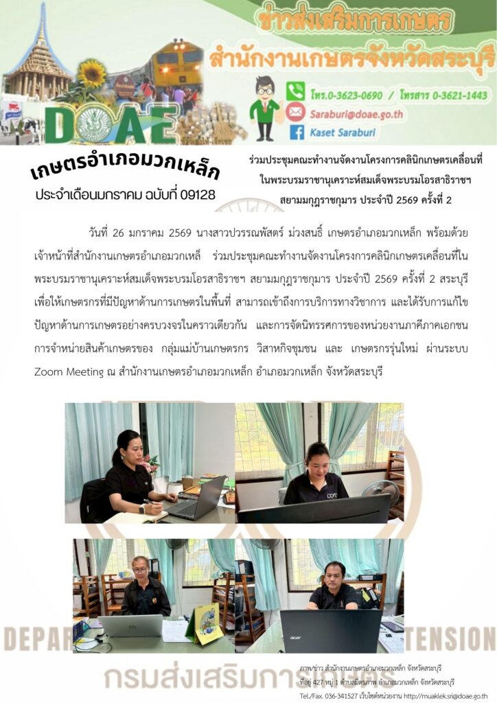 วันที่ 26 มกราคม 2569 นางสาวปวรรณพัสตร์ ม่วงสนธิ์ เกษตรอำเภอมวกเหล็ก พร้อมด้วย เจ้าหน้าที่สำนักงานเกษตรอำเภอมวกเหล็ ร่วมประชุมคณะทำงานจัดงานโครงการคลินิกเกษตรเคลื่อนที่ในพระบรมราชานุเคราะห์สมเด็จพระบรมโอรสาธิราชฯ สยามมกุฎราชกุมาร ประจำปี 2569 ครั้งที่ 2 สระบุรี เพื่อให้เกษตรกรที่มีปัญหาด้านการเกษตรในพื้นที่ สามารถเข้าถึงการบริการทางวิชาการ และได้รับการแก้ไขปัญหาด้านการเกษตรอย่างครบวงจรในคราวเดียวกัน และการจัดนิทรรศการของหน่วยงานภาคีภาคเอกชน การจำหน่ายสินค้าเกษตรของ กลุ่มแม่บ้านเกษตรกร วิสาหกิจชุมชน และ เกษตรกรรุ่นใหม่ ผ่านระบบ Zoom Meeting ณ สำนักงานเกษตรอำเภอมวกเหล็ก อำเภอมวกเหล็ก จังหวัดสระบุรี