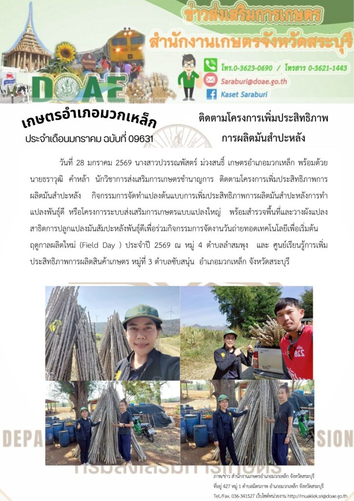 วันที่ 28 มกราคม 2569 นางสาวปวรรณพัสตร์ ม่วงสนธิ์ เกษตรอำเภอมวกเหล็ก พร้อมด้วย นายธราวุฒิ คำหล้า นักวิชาการส่งเสริมการเกษตรชำนาญการ ติดตามโครงการเพิ่มประสิทธิภาพการผลิตมันสำปะหลัง กิจกรรมการจัดทำแปลงต้นแบบการเพิ่มประสิทธิภาพการผลิตมันสำปะหลังการทำแปลงพันธุ์ดี หรือโครงการระบบส่งเสริมการเกษตรแบบแปลงใหญ่ พร้อมสำรวจพื้นที่และวางผังแปลงสาธิตการปลูกแปลงมันสัมปะหลังพันธุ์ดีเพื่อร่วมกิจกรรมการจัดงานวันถ่ายทอดเทคโนโลยีเพื่อเริ่มต้นฤดูกาลผลิตใหม่ (Field Day ) ประจำปี 2569 ณ หมู่ 4 ตำบลลำสมพุง และ ศูนย์เรียนรู้การเพิ่มประสิทธิภาพการผลิตสินค้าเกษตร หมู่ที่ 3 ตำบลซับสนุ่่น อำเภอมวกเหล็ก จังหวัดสระบุรี