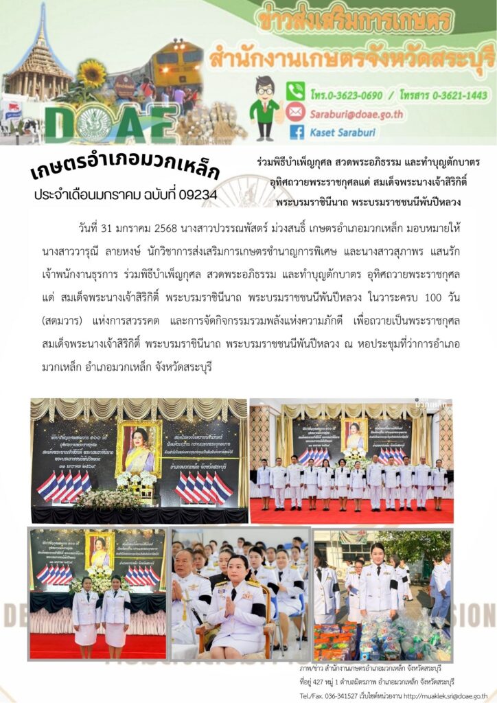 วันที่ 31 มกราคม 2568 นางสาวปวรรณพัสตร์ ม่วงสนธิ์ เกษตรอำเภอมวกเหล็ก มอบหมายให้ นางสาววารุณี ลายหงษ์ นักวิชาการส่งเสริมการเกษตรชำนาญการพิเศษ และนางสาวสุภาพร แสนรัก เจ้าพนักงานธุรการ ร่วมพิธีบำเพ็ญกุศล สวดพระอภิธรรม และทำบุญตักบาตร อุทิศถวายพระราชกุศลแด่ สมเด็จพระนางเจ้าสิริกิติ์ พระบรมราชินีนาถ พระบรมราชชนนีพันปีหลวง ในวาระครบ 100 วัน (สตมวาร) แห่งการสวรรคต และการจัดกิจกรรมรวมพลังแห่งความภักดี เพื่อถวายเป็นพระราชกุศลสมเด็จพระนางเจ้าสิริกิติ์ พระบรมราชินีนาถ พระบรมราชชนนีพันปีหลวง ณ หอประชุมที่ว่าการอำเภอมวกเหล็ก อำเภอมวกเหล็ก จังหวัดสระบุรี