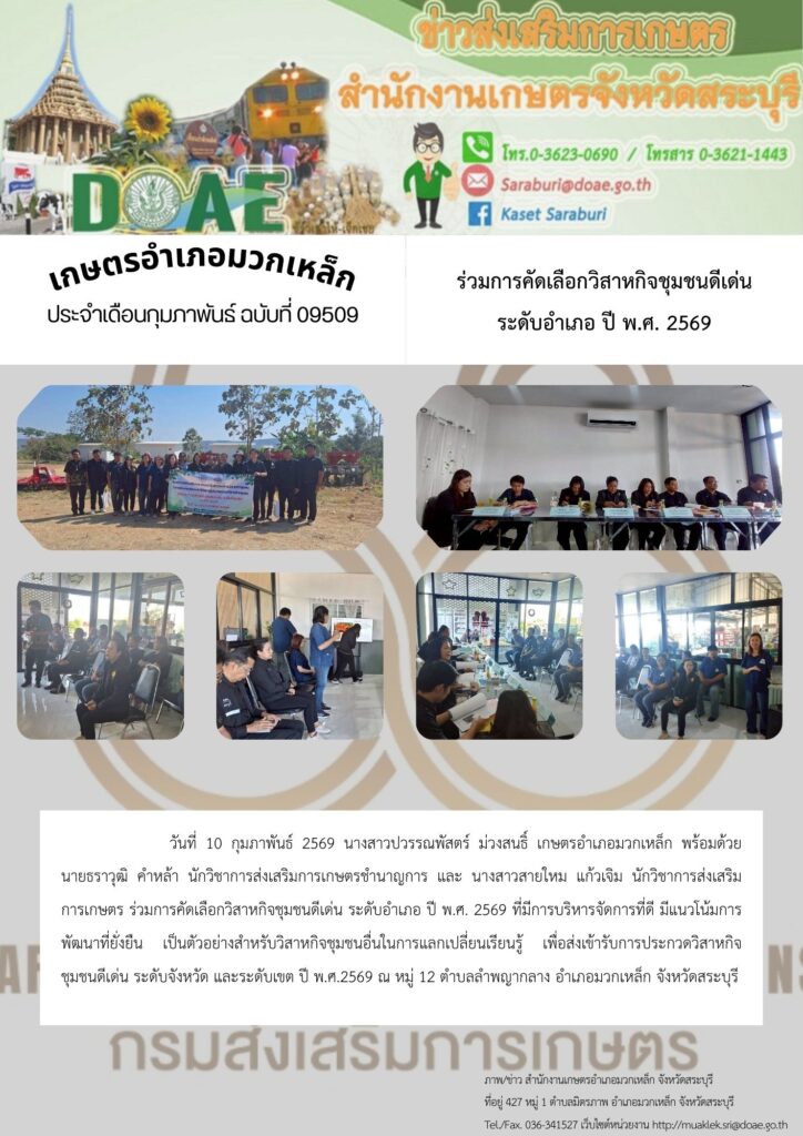 วันที่ 10 กุมภาพันธ์ 2569 นางสาวปวรรณพัสตร์ ม่วงสนธิ์ เกษตรอำเภอมวกเหล็ก พร้อมด้วย นายธราวุฒิ คำหล้า นักวิชาการส่งเสริมการเกษตรชำนาญการ และ นางสาวสายใหม แก้วเจิม นักวิชาการส่งเสริมการเกษตร ร่วมการคัดเลือกวิสาหกิจชุมชนดีเด่น ระดับอำเภอ ปี พ.ศ. 2569 ที่มีการบริหารจัดการที่ดี มีแนวโน้มการพัฒนาที่ยั่งยืน เป็นตัวอย่างสำหรับวิสาหกิจชุมชนอื่นในการแลกเปลี่ยนเรียนรู้ เพื่อส่งเข้ารับการประกวดวิสาหกิจชุมชนดีเด่น ระดับจังหวัด และระดับเขต ปี พ.ศ.2569 ณ หมู่ 12 ตำบลลำพญากลาง อำเภอมวกเหล็ก จังหวัดสระบุรี