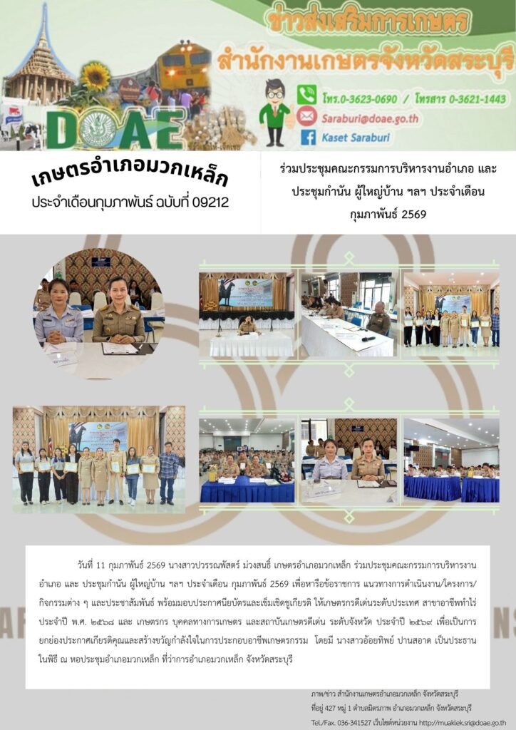 วันที่ 11 กุมภาพันธ์ 2569 นางสาวปวรรณพัสตร์ ม่วงสนธิ์ เกษตรอำเภอมวกเหล็ก ร่วมประชุมคณะกรรมการบริหารงานอำเภอ และ ประชุมกำนัน ผู้ใหญ่บ้าน ฯลฯ ประจำเดือน มกราคม 2569 เพื่อหารือข้อราชการ แนวทางการดำเนินงาน/โครงการ/กิจกรรมต่าง ๆ และประชาสัมพันธ์ พร้อมมอบประกาศนียบัตรและเข็มเชิดชูเกียรติ ให้เกษตรกรดีเด่นระดับประเทศ สาขาอาชีพทำไร่ ประจำปี พ.ศ. ๒๕๖๘ และ เกษตรกร บุคคลทางการเกษตร และสถาบันเกษตรดีเด่น ระดับจังหวัด ประจำปี ๒๕๖๙ เพื่อเป็นการยกย่องประกาศเกียรติคุณและสร้างขวัญกำลังใจในการประกอบอาชีพเกษตรกรรม โดยมี นางสาวอ้อยทิพย์ ปานสอาด เป็นประธานในพิธี ณ หอประชุมอำเภอมวกเหล็ก ที่ว่าการอำเภอมวกเหล็ก จังหวัดสระบุรี