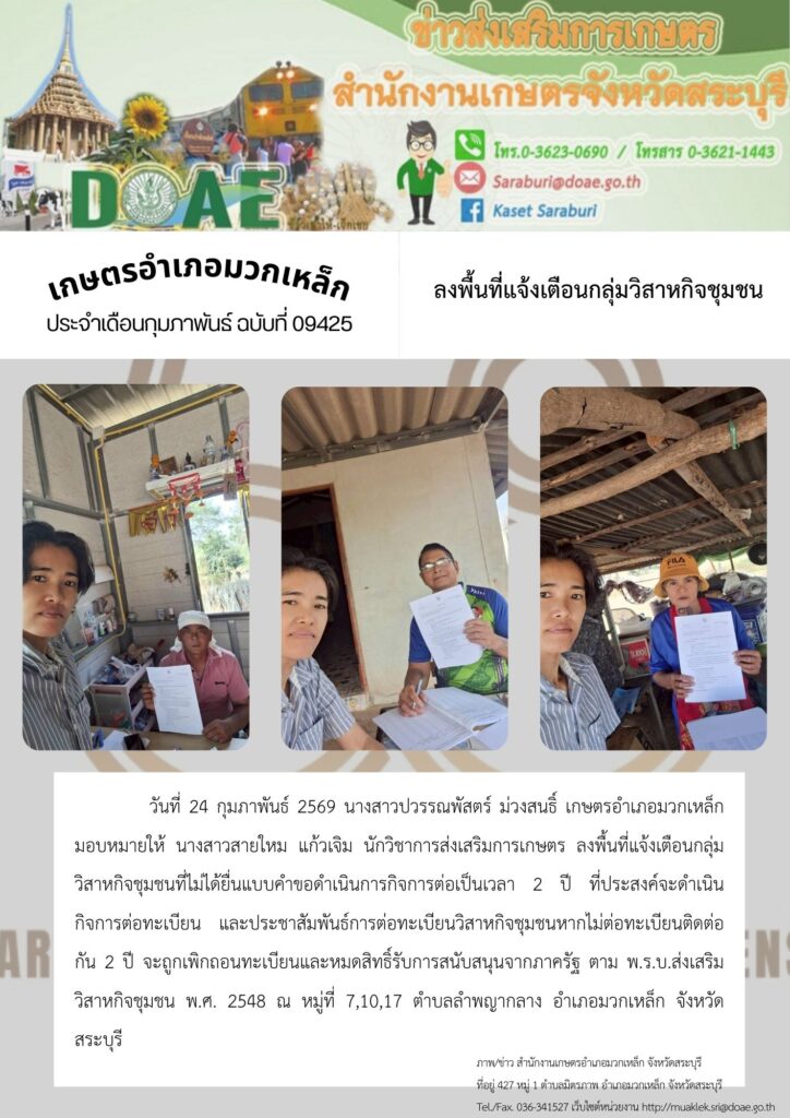วันที่ 24 กุมภาพันธ์ 2569 นางสาวปวรรณพัสตร์ ม่วงสนธิ์ เกษตรอำเภอมวกเหล็ก มอบหมายให้ นางสาวสายใหม แก้วเจิม นักวิชาการส่งเสริมการเกษตร ลงพื้นที่แจ้งเตือนกลุ่มวิสาหกิจชุมชนที่ไม่ได้ยื่นแบบคำขอดำเนินการกิจการต่อเป็นเวลา 2 ปี ที่ประสงค์จะดำเนินกิจการต่อทะเบียน และประชาสัมพันธ์การต่อทะเบียนวิสาหกิจชุมชนหากไม่ต่อทะเบียนติดต่อกัน 2 ปี จะถูกเพิกถอนทะเบียนและหมดสิทธิ์รับการสนับสนุนจากภาครัฐ ตาม พ.ร.บ.ส่งเสริมวิสาหกิจชุมชน พ.ศ. 2548 ณ หมู่ที่ 7,10,17 ตำบลลำพญากลาง อำเภอมวกเหล็ก จังหวัดสระบุรี