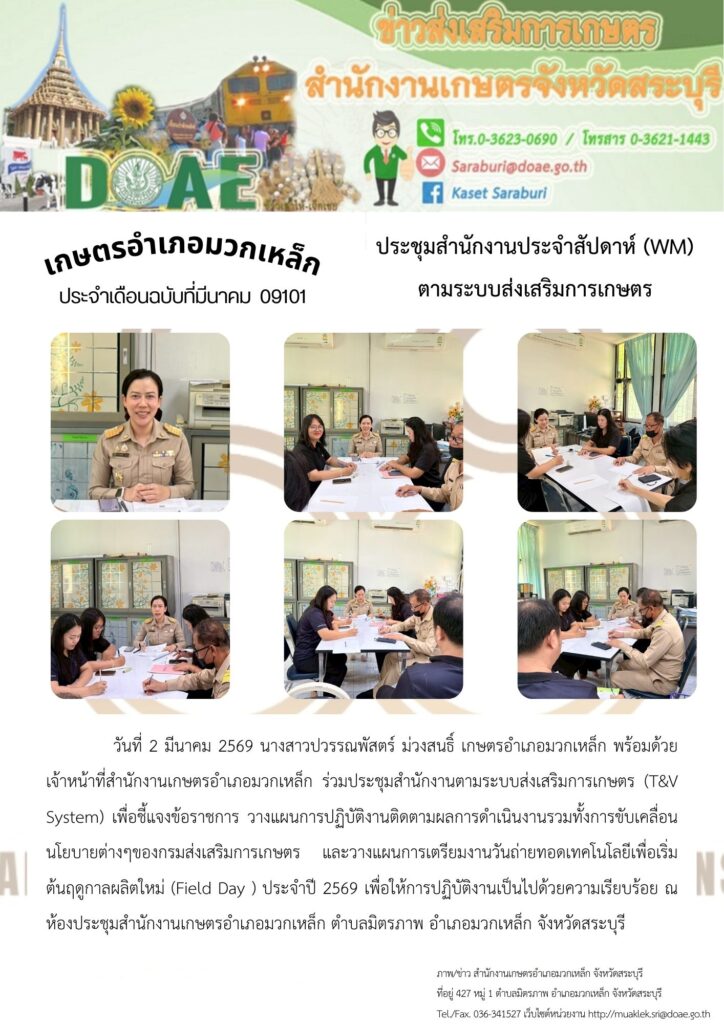 วันที่ 2 มีนาคม 2569 นางสาวปวรรณพัสตร์ ม่วงสนธิ์ เกษตรอำเภอมวกเหล็ก พร้อมด้วย เจ้าหน้าที่สำนักงานเกษตรอำเภอมวกเหล็ก ร่วมประชุมสำนักงานตามระบบส่งเสริมการเกษตร (T&V System) เพื่อชี้แจงข้อราชการ วางแผนการปฏิบัติงานติดตามผลการดำเนินงานรวมทั้งการขับเคลื่อนนโยบายต่างๆของกรมส่งเสริมการเกษตร และวางแผนการเตรียมงานวันถ่ายทอดเทคโนโลยีเพื่อเริ่มต้นฤดูกาลผลิตใหม่ (Field Day ) ประจำปี 2569 เพื่อให้การปฏิบัติงานเป็นไปด้วยความเรียบร้อย ณ ห้องประชุมสำนักงานเกษตรอำเภอมวกเหล็ก ตำบลมิตรภาพ อำเภอมวกเหล็ก จังหวัดสระบุรี