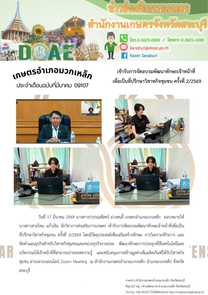 วันที่ 17 มีนาคม 2569 นางสาวปวรรณพัสตร์ ม่วงสนธิ์ เกษตรอำเภอมวกเหล็ก มอบหมายให้ นางสาวสายใหม แก้วเจิม นักวิชาการส่งเสริมการเกษตร เข้ารับการจัดอบรมพัฒนาทักษะเจ้าหน้าที่เพื่อเป็น ที่ปรึกษาวิสาหกิจชุมชน ครั้งที่ 2/2569 โดยมีวัตถุประสงค์เพื่อเสริมสร้างทักษะ การวิเคราะห์กิจการ และ จัดทำแผนธุรกิจสำหรับวิสาหกิจชุมชนและหน่วยธุรกิจรายย่อย พัฒนาทักษะการประยุกต์ใช้เทคโนโลยีและนวัตกรรมให้เจ้าหน้าที่ที่สามารถถ่ายทอดความรู้ และสนับสนุนการสร้างมูลค่าเพิ่มผลิตภัณฑ์ให้กับวิสาหกิจชุมชน ผ่านระบบออนไลน์ Zoom Meeting ณ สำนักงานเกษตรอำเภอมวกเหล็ก อำเภอมวกเหล็ก จังหวัดสระบุรี