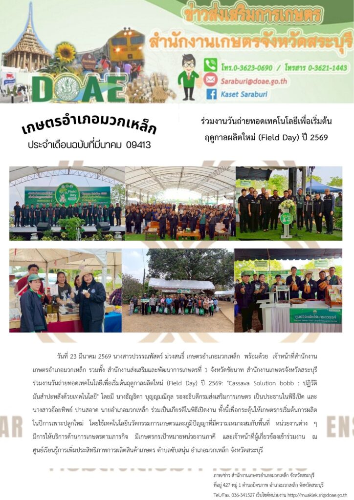 วันที่ 23 มีนาคม 2569 นางสาวปวรรณพัสตร์ ม่วงสนธิ์ เกษตรอำเภอมวกเหล็ก พร้อมด้วย เจ้าหน้าที่สำนักงานเกษตรอำเภอมวกเหล็ก รวมทั้ง สำนักงานส่งเสริมและพัฒนาการเกษตรที่ 1 จังหวัดชัยนาท สำนักงานเกษตรจังหวัดสระบุรี ร่วมงานวันถ่ายทอดเทคโนโลยีเพื่อเริ่มต้นฤดูกาลผลิตใหม่ (Field Day) ปี 2569: “Cassava Solution bobb : ปฏิวัติ มันสำปะหลังด้วยเทคโนโลยี” โดยมี นางธัญธิตา บุญญมณีกุล รองอธิบดีกรมส่งเสริมการเกษตร เป็นประธานในพิธีเปิด และ นางสาวอ้อยทิพย์ ปานสอาด นายอำเภอมวกเหล็ก ร่วมเป็นเกียรติในพิธีเปิดงาน เพื่อกระตุ้นให้เกษตรกรเริ่มต้นการผลิตในปีการเพาะปลูกใหม่ โดยใช้เทคโนโลยีนวัตกรรมการเกษตรและภูมิปัญญาที่มีความเหมาะสมกับพื้นที่ หน่วยงานต่าง ๆ มีการให้บริการด้านการเกษตรตามภารกิจ มีเกษตรกรเป้าหมายหน่วยงานภาคี และเจ้าหน้าที่ผู้เกี่ยวข้องเข้าร่วมงาน ณ ศูนย์เรียนรู้การเพิ่มประสิทธิภาพการผลิตสินค้าเกษตร ตำบลซับสนุ่น อำเภอมวกเหล็ก จังหวัดสระบุรี