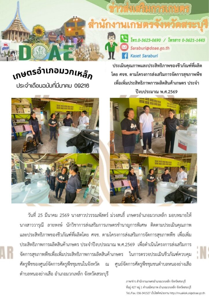 วันที่ 25 มีนาคม 2569 นางสาวปวรรณพัสตร์ ม่วงสนธิ์ เกษตรอำเภอมวกเหล็ก มอบหมายให้ นางสาววารุณี ลายหงษ์ นักวิชาการส่งเสริมการเกษตรชำนาญการพิเศษ ติดตามประเมินคุณภาพและประสิทธิภาพของชีวภัณฑ์ที่ผลิตโดย ศจช. ตามโครงการส่งเสริมการจัดการสุขภาพพืช เพื่อเพิ่มประสิทธิภาพการผลิตสินค้าเกษตร ประจำปีงบประมาณ พ.ศ.2569 เพื่อดำเนินโครงการส่งเสริมการจัดการสุขภาพพืชเพื่อเพิ่มประสิทธิภาพการผลิตสินค้าเกษตร ในการตรวจประเมินชีวภัณฑ์ควบคุมศัตรูพืชของศูนย์จัดการศัตรูพืชชุมชนในจังหวัด ณ ศูนย์จัดการศัตรูพืชชุมชนตำบลหนองย่างเสือ ตำบลหนองย่างเสือ อำเภอมวกเหล็ก จังหวัดสระบุรี