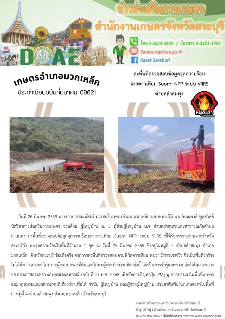 วันที่ 26 มีนาคม 2569 นางสาวปวรรณพัสตร์ ม่วงสนธิ์ เกษตรอำเภอมวกเหล็ก มอบหมายให้ นายกันณพงศ์ พูลสวัสดิ์ นักวิชาการส่งเสริมการเกษตร ร่วมด้วย ผู้ใหญ่บ้าน ม. 5 ผู้ช่วยผู้ใหญ่บ้าน ม.4 ตำบลลำสมพุงและสาธารณภัยตำบล ลำสมพุง ลงพื้นที่ตรวจสอบข้อมูลจุดความร้อนจากดาวเทียม Suomi NPP ระบบ VIIRS ที่ได้รับการรายงานจากจังหวัดสระบุรีว่า พบจุดความร้อนในพื้นที่จำนวน 1 จุด ณ วันที่ 25 มีนาคม 2569 ซึ่งอยู่ในหมู่ที่ 5 ตำบลลำสมพุง อำเภอ มวกเหล็ก จังหวัดสระบุรี ข้อเท็จจริง จากการลงพื้นที่ตรวจสอบตามพิกัดดาวเทียม พบว่า มีการเผาจริง ซึ่งเป็นพื้นที่รกร้าง ไม่ได้ทำการเกษตร ไม่ทราบผู้ครอบครองที่ดินและไม่พบผู้กระทำความผิด ทั้งนี้ ได้สร้างการรับรู้และความเข้าใจในมาตรการของประกาศกระทรวงเกษตรและสหกรณ์ (ฉบับที่ 2) พ.ศ. 2568 เพื่อจัดการปัญหาฝุ่น PM₂.₅ จากการเผาในพื้นที่เกษตร และกฎหมายและผลกระทบที่เกี่ยวข้องเพื่อให้ กำนัน ผู้ใหญ่บ้าน และผู้ช่วยผู้ใหญ่บ้าน ประชาสัมพันธ์แก่เกษตรกรในพื้นที่ ณ หมู่ที่ 4 ตำบลลำสมพุง อำเภอมวกเหล็ก จังหวัดสระบุรี