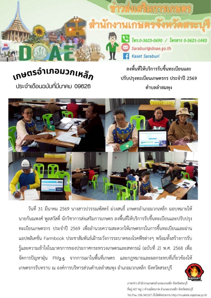 วันที่ 31 มีนาคม 2569 นางสาวปวรรณพัสตร์ ม่วงสนธิ์ เกษตรอำเภอมวกเหล็ก มอบหมายให้ นายกันณพงศ์ พูลสวัสดิ์ นักวิชาการส่งเสริมการเกษตร ลงพื้นที่ให้บริการรับขึ้นทะเบียนและปรับปรุงทะเบียนเกษตรกร ประจำปี 2569 เพื่ออำนวยความสะดวกให้เกษตรกรในการขึ้นทะเบียนและผ่านแอปพลิเคชั่น Farmbook ประชาสัมพันธ์เฝ้าระวังการระบาดของโรคพืชต่างๆ พร้อมทั้งสร้างการรับรู้และความเข้าใจในมาตรการของประกาศกระทรวงเกษตรและสหกรณ์ (ฉบับที่ 2) พ.ศ. 2568 เพื่อจัดการปัญหาฝุ่น PM₂.₅ จากการเผาในพื้นที่เกษตร และกฎหมายและผลกระทบที่เกี่ยวข้องให้เกษตรกรรับทราบ ณ องค์การบริหารส่วนตำบลลำสมพุง อำเภอมวกเหล็ก จังหวัดสระบุรี