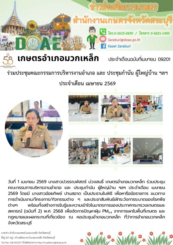 วันที่ 1 เมษายน 2569 นางสาวปวรรณพัสตร์ ม่วงสนธิ์ เกษตรอำเภอมวกเหล็ก ร่วมประชุมคณะกรรมการบริหารงานอำเภอ และ ประชุมกำนัน ผู้ใหญ่บ้าน ฯลฯ ประจำเดือน เมษายน 2569 โดยมี นางสาวอ้อยทิพย์ ปานสอาด เป็นประธานในพิธี เพื่อหารือข้อราชการ แนวทางการดำเนินงาน/โครงการ/กิจกรรมต่าง ๆ และประชาสัมพันธ์เฝ้าระวังการระบาดของโรคพืชต่างๆ พร้อมทั้งสร้างการรับรู้และความเข้าใจในมาตรการของประกาศกระทรวงเกษตรและสหกรณ์ (ฉบับที่ 2) พ.ศ. 2568 เพื่อจัดการปัญหาฝุ่น PM₂.₅ จากการเผาในพื้นที่เกษตร และกฎหมายและผลกระทบที่เกี่ยวข้อง ณ หอประชุมอำเภอมวกเหล็ก ที่ว่าการอำเภอมวกเหล็ก จังหวัดสระบุรี