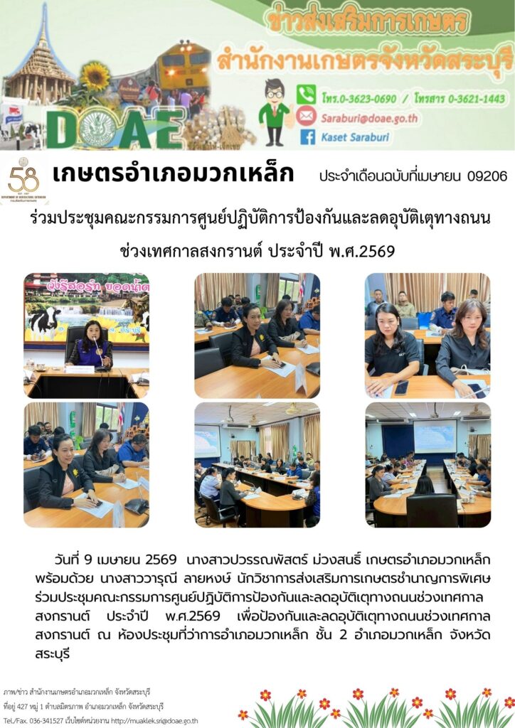 วันที่ 9 เมษายน 2569 นางสาวปวรรณพัสตร์ ม่วงสนธิ์ เกษตรอำเภอมวกเหล็ก พร้อมด้วย นางสาววารุณี ลายหงษ์ นักวิชาการส่งเสริมการเกษตรชำนาญการพิเศษ ร่วมประชุมคณะกรรมการศูนย์ปฏิบัติการป้องกันและลดอุบัติเตุทางถนนช่วงเทศกาลสงกรานต์ ประจำปี พ.ศ.2569 เพื่อป้องกันและลดอุบัติเตุทางถนนช่วงเทศกาลสงกรานต์ ณ ห้องประชุมที่ว่าการอำเภอมวกเหล็ก ชั้น 2 อำเภอมวกเหล็ก จังหวัดสระบุรี