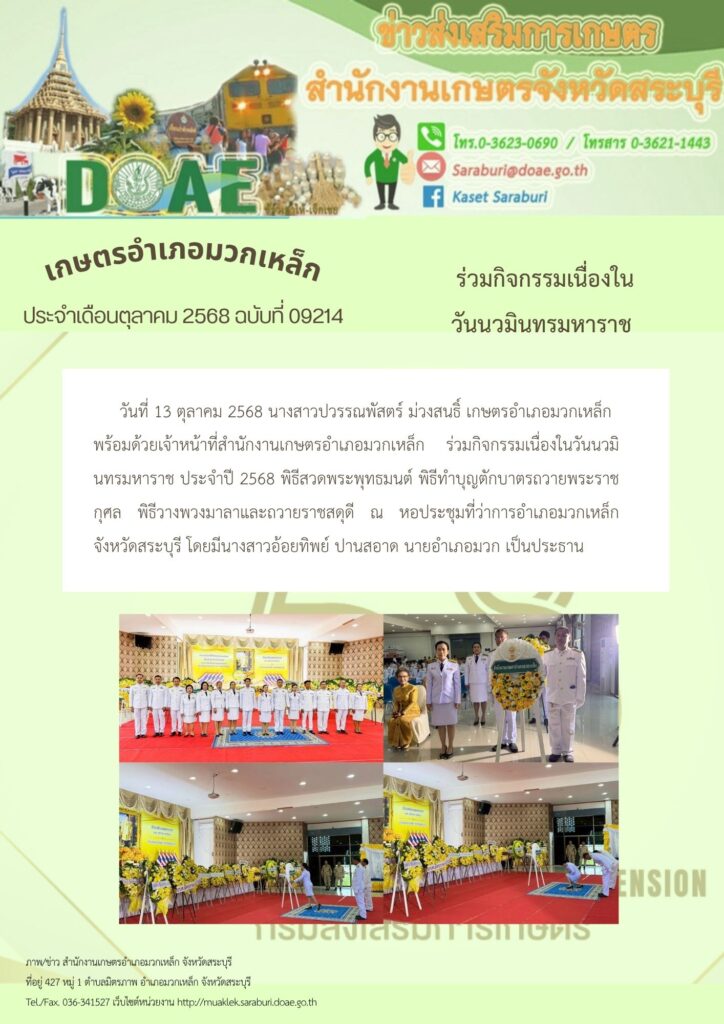 วันที่ 13 ตุลาคม 2568 นางสาวปวรรณพัสตร์ ม่วงสนธิ์ เกษตรอำเภอมวกเหล็ก พร้อมด้วยเจ้าหน้าที่สำนักงานเกษตรอำเภอมวกเหล็ก ร่วมกิจกรรมเนื่องในวันนวมินทรมหาราช ประจำปี 2568 พิธีสวดพระพุทธมนต์ พิธีทำบุญตักบาตรถวายพระราชกุศล พิธีวางพวงมาลาและถวายราชสดุดี ณ หอประชุมที่ว่าการอำเภอมวกเหล็ก จังหวัดสระบุรี โดยมีนางสาวอ้อยทิพย์ ปานสอาด นายอำเภอมวก เป็นประธาน