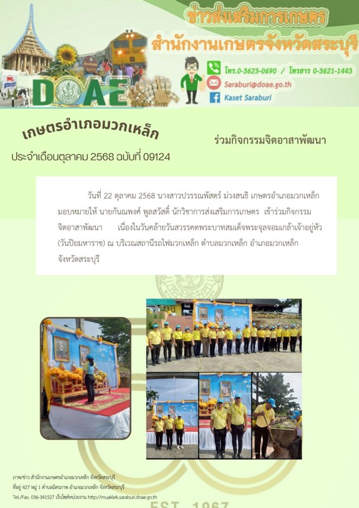 วันที่ 22 ตุลาคม 2568 นางสาวปวรรณพัสตร์ ม่วงสนธิ เกษตรอำเภอมวกเหล็กมอบหมายให้ นายกันณพงศ์ พูลสวัสดิ์ นักวิชาการส่งเสริมการเกษตร เข้าร่วมกิจกรรมจิตอาสาพัฒนา เนื่องในวันคล้ายวันสวรรคตพระบาทสมเด็จพระจุลจอมเกล้าเจ้าอยู่หัว (วันปิยมหาราช) ณ บริเวณสถานีรถไฟมวกเหล็ก ตำบลมวกเหล็ก อำเภอมวกเหล็ก จังหวัดสระบุรี