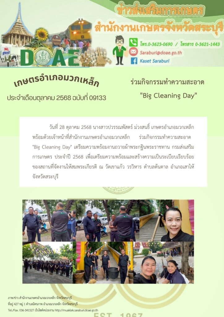 วันที่ 28 ตุลาคม 2568 นางสาวปวรรณพัสตร์ ม่วงสนธิ์ เกษตรอำเภอมวกเหล็ก พร้อมด้วยเจ้าหน้าที่สำนักงานเกษตรอำเภอมวกเหล็ก ร่วมกิจกรรมทำความสะอาด”Big Cleaning Day” เตรียมความพร้อมงานถวายผ้าพระกฐินพระราชทาน กรมส่งเสริมการเกษตร ประจำปี 2568 เพื่อเตรียมความพร้อมและสร้างความเป็นระเบียบเรียบร้อยของสถานที่จัดงานให้สมพระเกียรติ ณ วัดเขาแก้ว วรวิหาร ตำบลต้นตาล อำเภอเสาไห้ จังหวัดสระบุรี