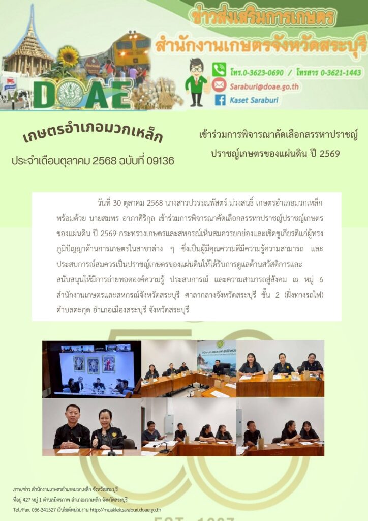 วันที่ 30 ตุลาคม 2568 นางสาวปวรรณพัสตร์ ม่วงสนธิ์ เกษตรอำเภอมวกเหล็ก พร้อมด้วย นายสมพร อาภาศิริกุล เข้าร่วมการพิจารณาคัดเลือกสรรหาปราชญ์ปราชญ์เกษตรของแผ่นดิน ปี 2569 กระทรวงเกษตรและสหกรณ์เห็นสมควรยกย่องและเชิดชูเกียรติแก่ผู้ทรงภูมิปัญญาด้านการเกษตรในสาขาต่าง ๆ ซึ่งเป็นผู้มีคุณความดีมีความรู้ความสามารถ และประสบการณ์สมควรเป็นปราชญ์เกษตรของแผ่นดินให้ได้รับการดูแลด้านสวัสดิการและสนับสนุนให้มีการถ่ายทอดองค์ความรู้ ประสบการณ์ และความสามารถสู่สังคม ณ หมู่ 6 สำนักงานเกษตรและสหกรณ์จังหวัดสระบุรี ศาลากลางจังหวัดสระบุรี ชั้น 2 (ฝั่งทางรถไฟ) ตำบลตะกุด อำเภอเมืองสระบุรี จังหวัดสระบุรี