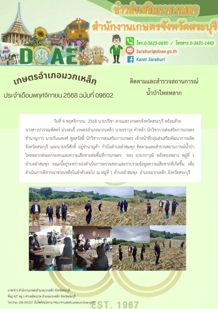 วันที่ 4 พฤศจิกายน 2568 นายปรีชา สายแสง เกษตรจังหวัดสระบุรี พร้อมด้วย นางสาวปวรรณพัสตร์ ม่วงสนธิ์ เกษตรอำเภอมวกเหล็ก นายธราวุธ คำหล้า นักวิชาการส่งเสริมการเกษตรชำนาญการ นายกันณพงศ์ พูลสวัสดิ์ นักวิชาการส่งเสริมการเกษตร และเจ้าหน้าที่กลุ่มส่งเสริมพัฒนาการผลิตจังหวัดสระบุรี ติดตามและสำรวจสถานการณ์น้ำป่าไหลหลากส่งผลกระทบและความเสียหายต่อพื้นที่การเกษตร ของ นายวราวุฒิ หลั่งทองหลาง หมู่ที่ 1 ตำบลลำสมพุง ขณะนี้อยู่ระหว่างเร่งดำเนินการตรวจสอบและรวบรวมข้อมูลความเสียหายที่เกิดขึ้นเพื่อดำเนินการพิจารณาช่วยเหลือในลำดับต่อไป ณ หมู่ที่ 1 ตำบลลำสมพุง อำเภอมวกเหล็ก จังหวัดสระบุรี