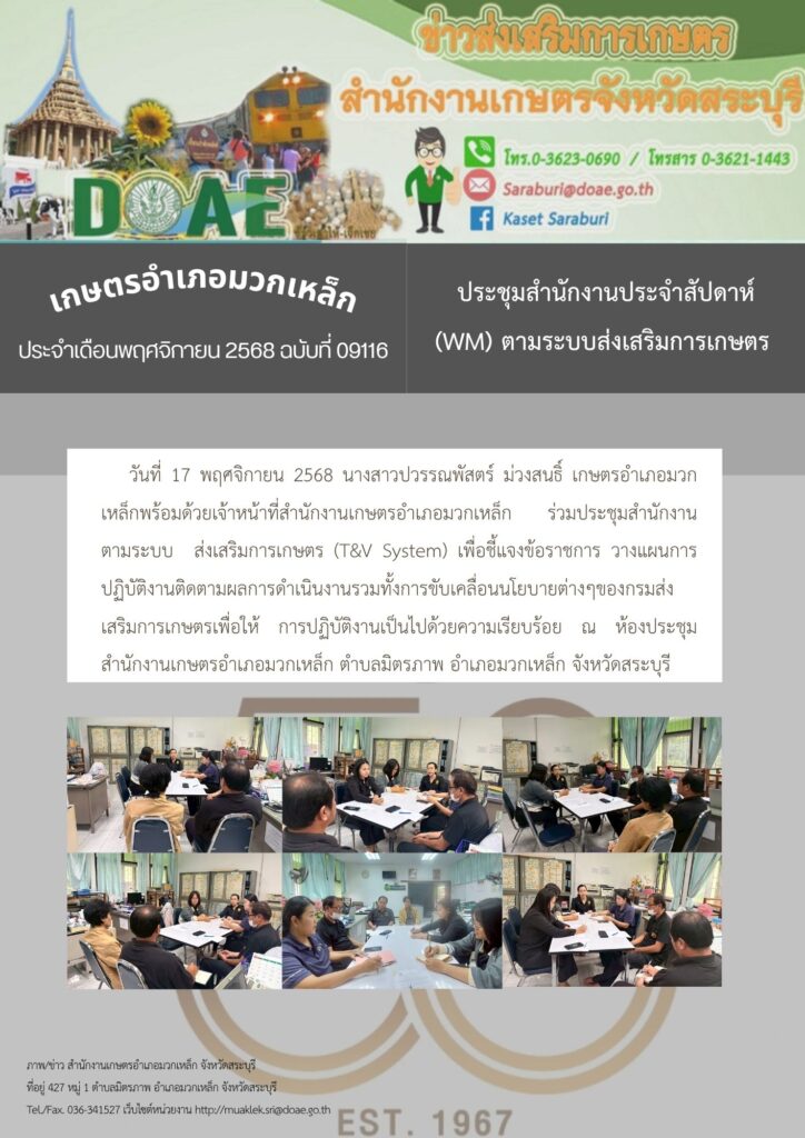 วันที่ 17 พฤศจิกายน 2568 นางสาวปวรรณพัสตร์ ม่วงสนธิ์ เกษตรอำเภอมวกเหล็กพร้อมด้วยเจ้าหน้าที่สำนักงานเกษตรอำเภอมวกเหล็ก ร่วมประชุมสำนักงานตามระบบ ส่งเสริมการเกษตร (T&V System) เพื่อชี้แจงข้อราชการ วางแผนการปฏิบัติงานติดตามผลการดำเนินงานรวมทั้งการขับเคลื่อนนโยบายต่างๆของกรมส่งเสริมการเกษตรเพื่อให้ การปฏิบัติงานเป็นไปด้วยความเรียบร้อย ณ ห้องประชุมสำนักงานเกษตรอำเภอมวกเหล็ก ตำบลมิตรภาพ อำเภอมวกเหล็ก จังหวัดสระบุรี
