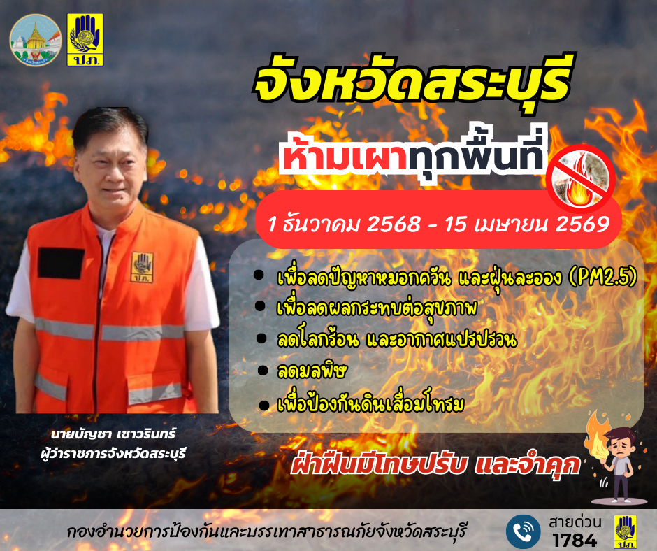 ประกาศกองอำนวยการป้องกันและบรรเทาสาธารณภัยจังหวัดสระบุรี เรื่อง กำหนดเขตควบคุมการเผาในที่โล่งทุกชนิด และมาตรการทางกฎหมายในการควบคุม