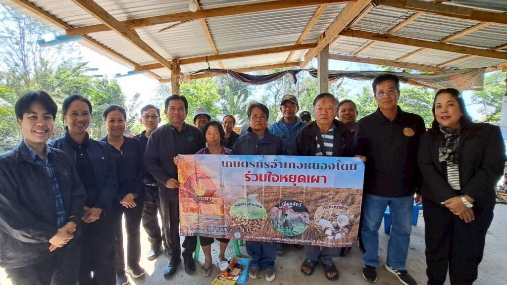 วันที่ 9 มกราคม 2569 นายโกสินทร์ แสงสวงค์ เกษตรอำเภอหนองโดน พร้อมด้วยเจ้าหน้าที่สำนักงานเกษตรอำเภอหนองโดน ลงพื้นที่จัดกระบวนการเรียนรู้ให้แก่เกษตรกรผู้นำ ตามโครงการศูนย์เรียนรู้การเพิ่มประสิทธิภาพการผลิตสินค้าเกษตร ประจำปีงบประมาณ พ.ศ. 2569 กิจกรรมย่อยเสริมสร้างศักยภาพเกษตรกรผู้นำ เป้าหมายเกษตรกรผู้นำ จำนวน 10 ราย โดยมีวัตถุประสงค์เพื่อถ่ายทอดความรู้ให้เกษตรกรสามารถเพิ่มประสิทธิภาพการผลิตสินค้า เกษตรกรได้รับการพัฒนา เกิดความเข้มแข็ง และพึ่งพาตนเองได้ ซึ่งได้รับความอนุเคราะห์เจ้าหน้าที่จากสำนักงานเกษตรจังหวัดสระบุรีและสำนักงานตรวจบัญชีสหกรณ์ร่วมบรรยายให้ความรู้แก่เกษตรกร ในการนี้ ได้ดำเนินการประชาสัมพันธ์/สร้างการรับรู้การหยุดเผาในพื้นที่การเกษตรให้แก่ผู้เข้าร่วมกิจกรรมดังกล่าวด้วย ณ ศูนย์เรียนรู้การผลิตพืชไร่ “ไร่เกษมณี” เลขที่ 182 หมู่ 2 ตำบลบ้านกลับ อำเภอหนองโดน จังหวัดสระบุรี