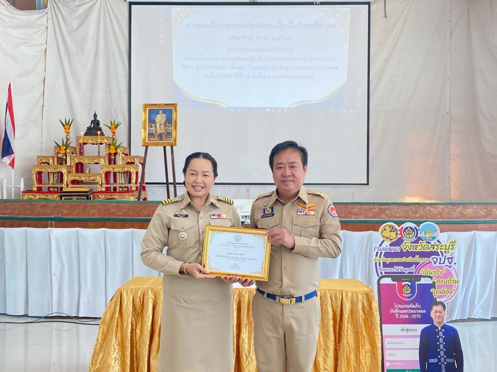 ในการนี้ ได้มอบใบประกาศเกียรติคุณเนื่องในวันตรีสากลประจำปี พ.ศ. 2569 เพื่อแสดงว่า นางรักชนก ตั้งทอง เป็นสตรีดีเด่น ด้านการส่งเสริมการเกษตร ระดับจังหวัด
