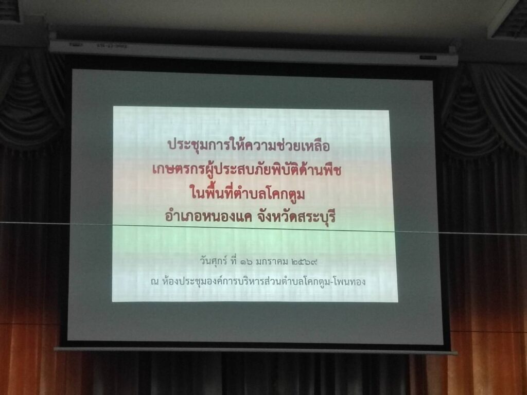 เมื่อวันที่ ๑๖ มกราคม ๒๕๖๙ นางสาวสิรยา เรืองศรี เกษตรอำเภอหนองแค มอบหมายให้ นางสาวฐิติมา ตรีโลเกศ นักวิชาการส่งเสริมการเกษตรปฏิบัติการ และนางสาวสุธัญญา นาคสังข์ นักวิชาการส่งเสริมการเกษตร สำนักงานเกษตรอำเภอหนองแค เข้าร่วมประชุมการให้ความช่วยเหลือเกษตรกรผู้ประสบภัยพิบัติด้านพืช เกษตรกรจำนวน ๒ ราย ในเขตพื้นที่ หมู่ที่ ๕ และ ๖ ตำบลโคกตูม เพื่อหารือให้ความช่วยเหลือเกษตรกรผู้ประสบภัยพิบัติด้านพืช ณ องค์การบริหารส่วนตำบลโคกตูม – โพนทอง อำเภอหนองแค จังหวัดสระบุรี