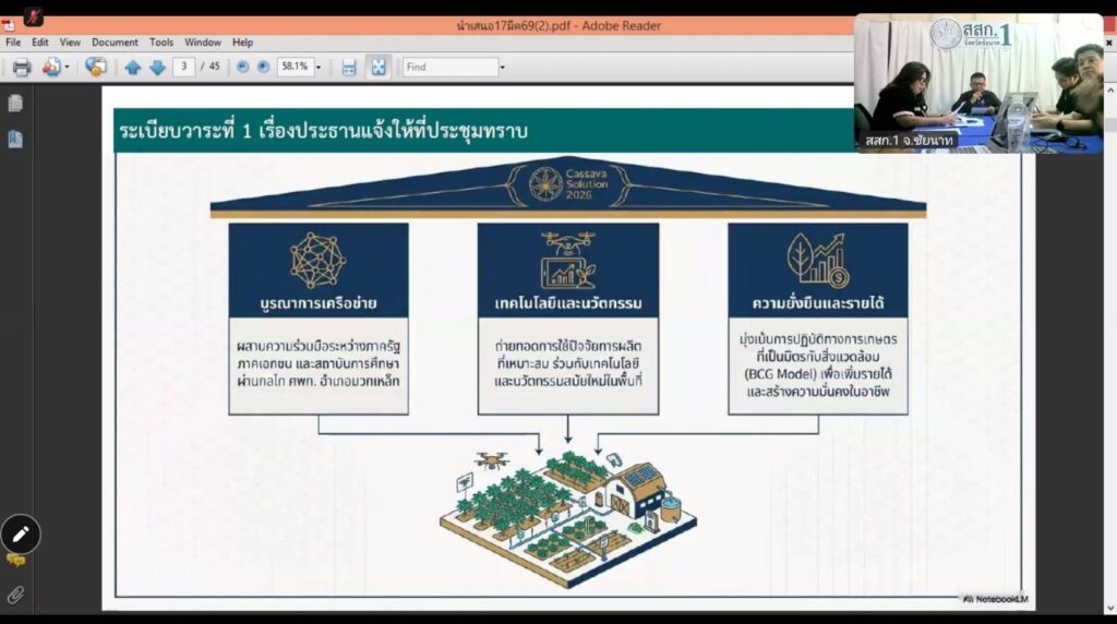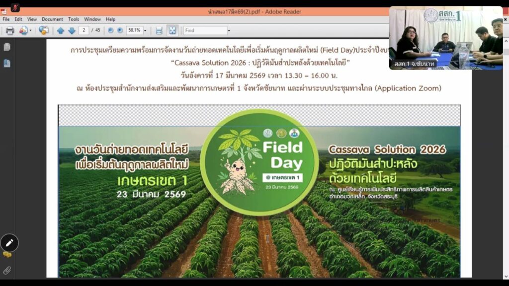 วันที่ 17 มีนาคม 2569 นางสาวสิรยา เรืองศรี เกษตรอำเภอหนองแค ร่วมประชุมเตรียมความพร้อมการจัดงานวันถ่ายทอดเทคโนโลยีเพื่อเริ่มต้นฤดูกาลผลิตใหม่(Field Day) ประจำปีงบประมาณ พ.ศ.2569 “Cassava Solution 2026 : ปฏิวัติมันสำปะหลังด้วยเทคโนโลยี” เพื่อกระตุ้นให้เกษตรกรเริ่มต้นการผลิตในปีการเพาะปลูกใหม่โดยใช้เทคโนโลยีนวัตกรรมการเกษตรและภูมิปัญญาที่มีความเหมาะสมกับพื้นที่ ในวันที่ 23 มีนาคม 2569 ณ ศูนย์เรียนรู้การเพิ่มประสิทธิภาพการผลิตสินค้าเกษตรอำเภอมวกเหล็ก ตำบลซับสนุ่น อำเภอมวกเหล็ก จังหวัดสระบุรี ผ่านระบบ Zoom Meeting ณ ห้องประชุมสำนักงานเกษตรอำเภอหนองแค จังหวัดสระบุรี