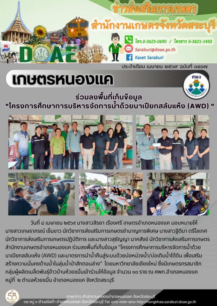 เกษตรหนองแค : ร่วมลงพื้นที่เก็บข้อมูล “โครงการศึกษาการบริหารจัดการน้ำด้วยนาเปียกสลับแห้ง (AWD)”By สำนักงานเกษตรอำเภอหนองแค / 08/04/2026