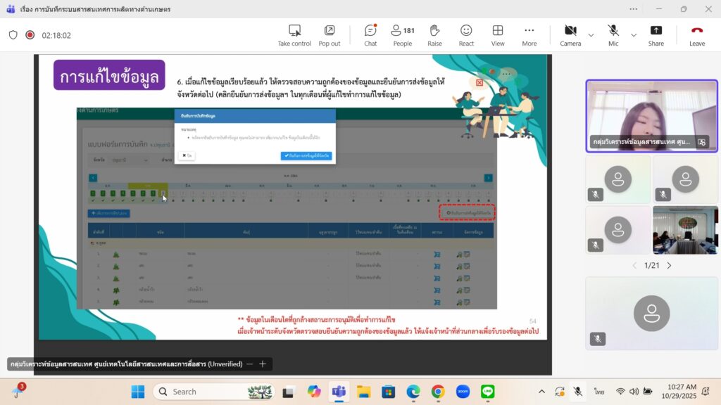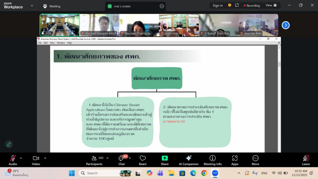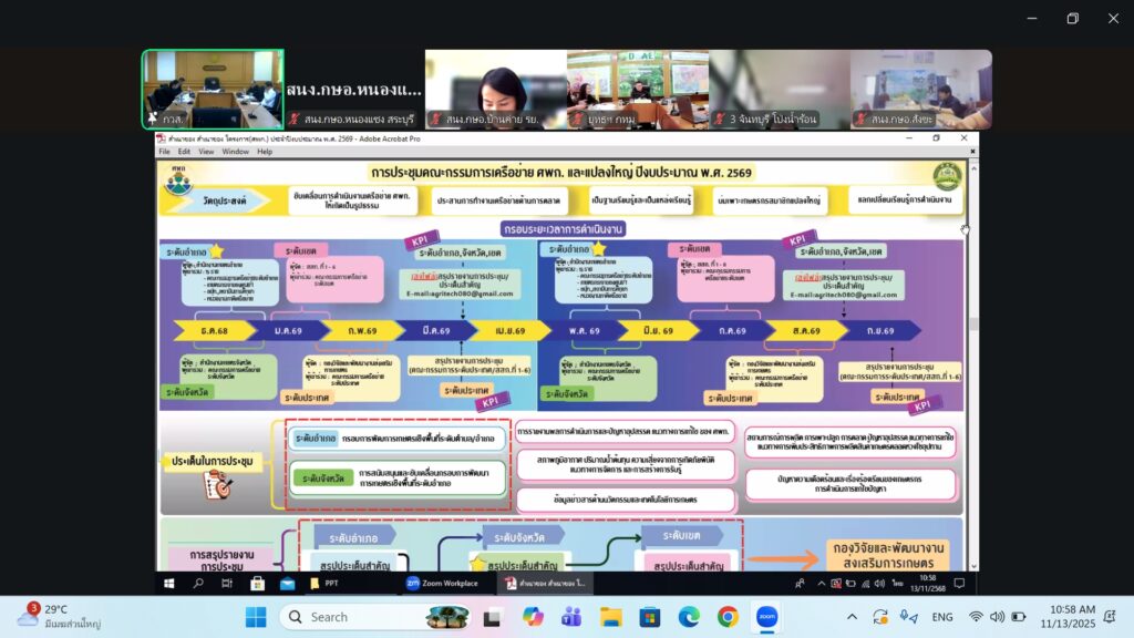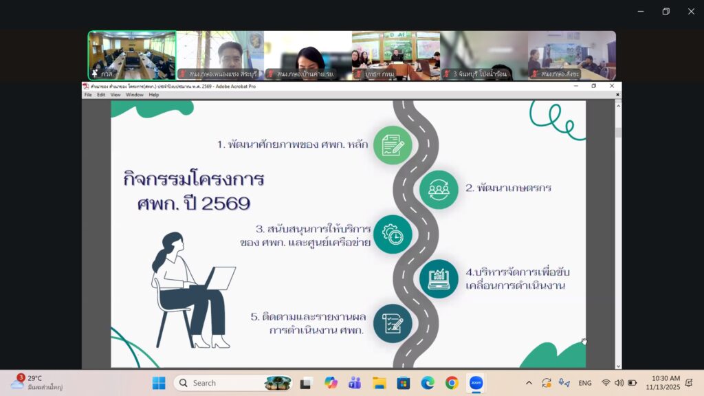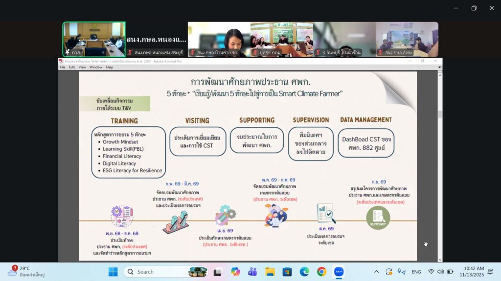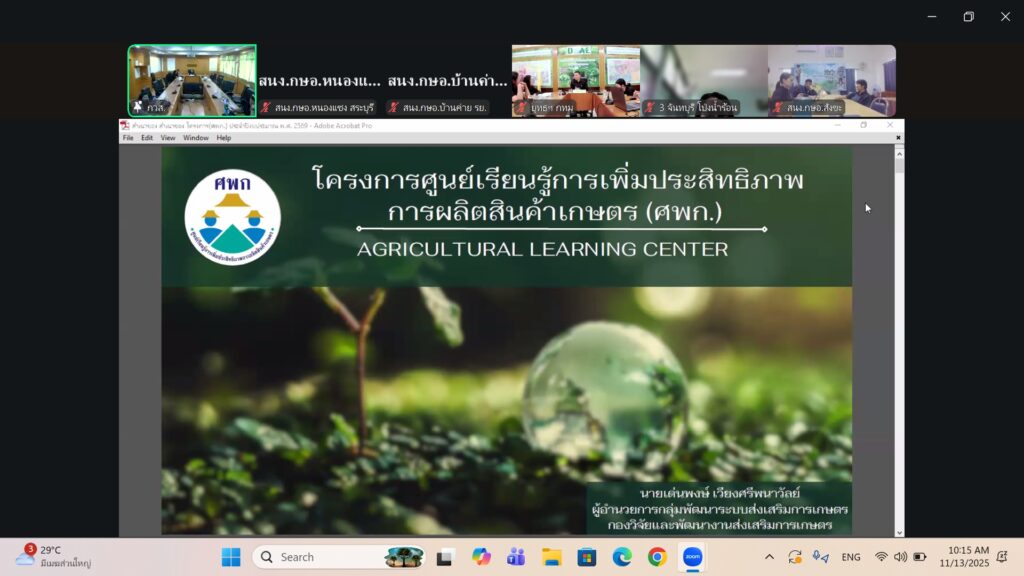 วันที่ 13 พฤศจิกายน 2568 เวลา 10.30 น. นางสาวอุษา จุลวรรณ เกษตรอำเภอหนองแซง พร้อมด้วย นายต่อพงษ์ วิมุกตะลพ นักวิชาการส่งเสริมการเกษตรชำนาญการ สำนักงานเกษตรอำเภอหนองแซง เข้าร่วมรับฟังคำชี้แจงการดำเนินงานโครงการศูนย์เรียนรู้การเพิ่มประสิทธิภาพการผลิตสินค้าเกษตร (ศพก.) ผ่านระบบออนไลน์ Application Zoom Meeting ณ สำนักงานเกษตรอำเภอหนองแซง จังหวัดสระบุรี เพื่อรับฟังแนวทางการขับเคลื่อนงานโครงการศูนย์เรียนรู้การเพิ่มประสิทธิภาพการผลิตสินค้าเกษตร (ศพก.) ประจำปีงบประมาณ พ.ศ. 2569