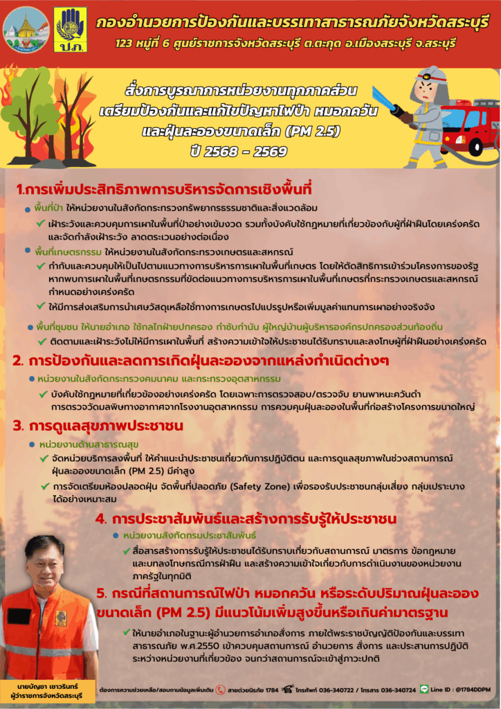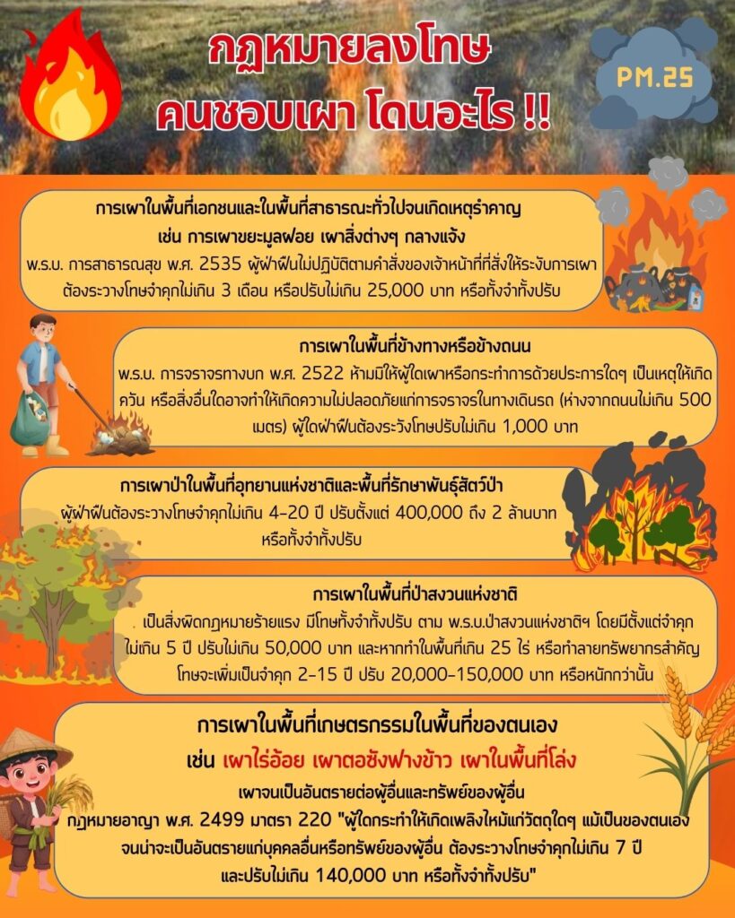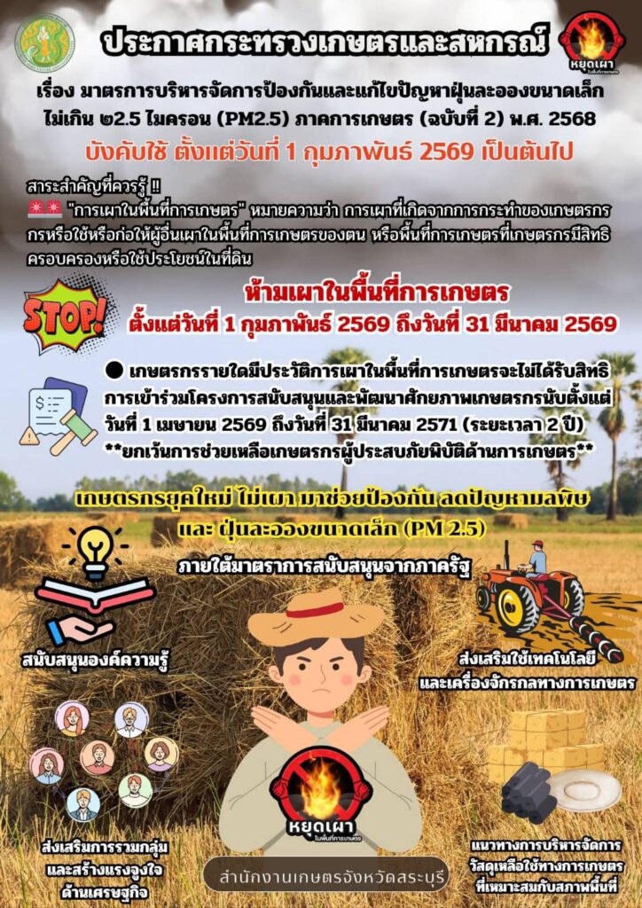 ข้อกฎหมายที่เกี่ยวข้องเกี่ยวกับการควบคุมการเผาในที่โล่ง ราชกิจจานุเบกษา เผยแพร่ประกาศกระทรวงเกษตรและสหกรณ์ เรื่อง มาตรการบริหารจัดการป้องกันและแก้ไขปัญหาฝุ่นละอองขนาดเล็กไม่เกิน 2.5 ไมครอน (PMc:) ภาคการเกษตร (ฉบับที่ 2) พ.ศ. 2568 ประกาศกองอำนวยการป้องกันและบรรเทาสาธารณภัยจังหวัดสระบุรีเรื่อง กำหนดเขตควบคุมการเผาในที่โล่งทุกชนิด และมาตรการทางกฎหมายในการควบคุม ภาพการประชาสัมพันธ์ สร้างการรับรู้มาตรการป้องกันและแก้ไขปัญหาการเผาในพื้นที่เกษตรกรรม