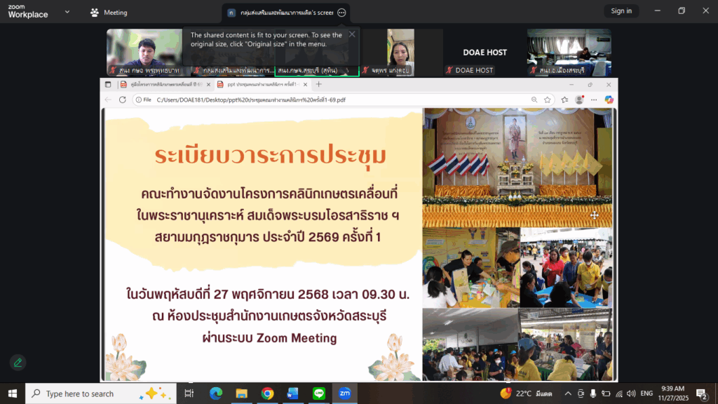 วันที่ 27 พฤศจิกายน 2568 นางสาวสิริรัตน์ หินอ่อน เกษตรอำเภอวิหารแดง รักษาราชการแทนเกษตรอำเภอพระพุทธบาท มอบหมายให้ นางปรานี จันทร์ทา นักวิชาการส่งเสริมการเกษตรชำนาญการ และเจ้าหน้าที่สำนักงานเกษตรอำเภอพระพุทธบาท เข้าร่วมประชุมตามคำสั่งคณะทำงานจัดงานโครงการคลินิกเกษตรเคลื่อนที่ในพระราชานุเคราะห์สมเด็จพระบรมโอรสาธิราช ฯ สยามมกุฎราชกุมาร ประจำปี 2569 ครั้งที่ 1 ผ่านระบบ Zoom meeting โดยมีวัตถุประสงค์เพื่อวางแผนการจัดงาน ชี้แจงบทบาทหน้าที่ สอบถามปัญหาและข้อเสนอจากการดำเนินงานที่ผ่านมา เพื่อให้การดำเนินงานเป็นไปตามวัตถุประสงค์ บรรลุผลสำเร็จตามเป้าหมาย ณ สำนักงานเกษตรอำเภอพระพุทธบาท จังหวัดสระบุรี