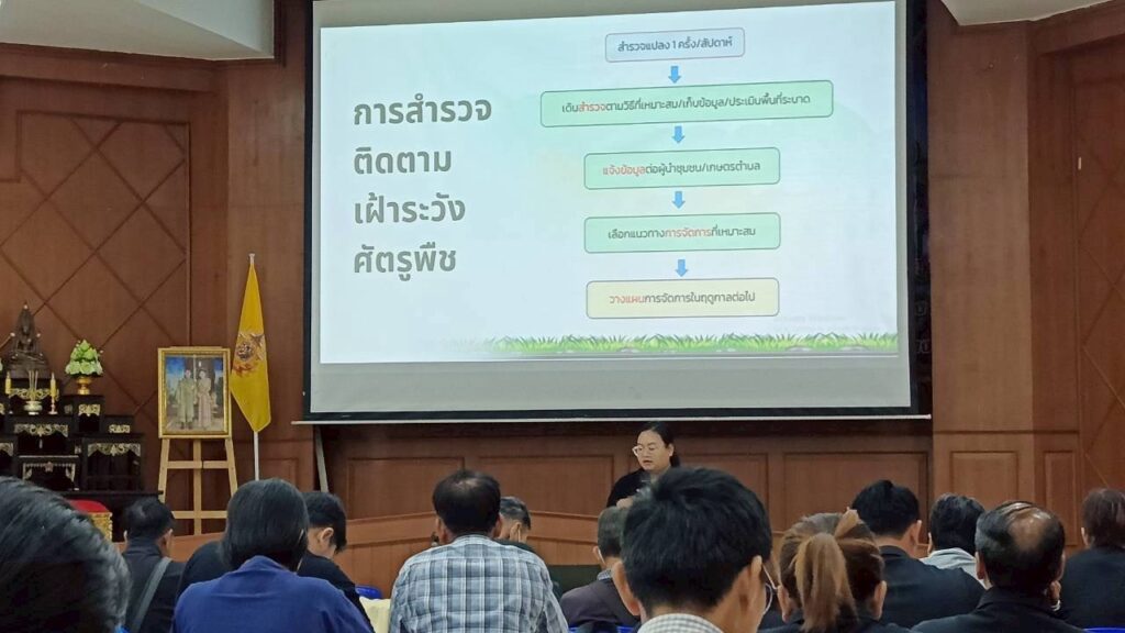 วันที่ 19 ธันวาคม 2568 นางสาวสิริรัตน์ หินอ่อน เกษตรอำเภอวิหารแดง รักษาราชการแทน เกษตรอำเภอพระพุทธบาท มอบหมาย นายพศกร โพธิ์พันธุ์ นักวิชาการส่งเสริมการเกษตรปฏิบัติการ เข้าร่วมบรมหลักสูตรการพัฒนาเกษตรกรผู้สำรวจแปลงติดตามสถานการณ์ศัตรูพืช ภายใต้โครงการส่งเสริมการจัดการสุขภาพพืชเพื่อเพิ่มประสิทธิภาพการผลิตสินค้าเกษตร กิจกรรมส่งเสริมการจัดการสุขภาพพืชเพื่อเพิ่มประสิทธิภาพการผลิตสินค้าเกษตร เฝ้าระวังและเตรียมความพร้อมรับมือสถานการณ์การระบาดศัตรูพืชเชิงรุก พัฒนาเกษตรกรผู้สำรวจแปลงติดตามสถานการณ์ศัตรูพืช ประจำปีงบประมาณ พ.ศ. ๒๕๖๙ โดยมีวัตถุประสงค์เพื่อพัฒนาเกษตรกรผู้สำรวจแปลงติดตามสถานการณ์ศัตรูพืช ณ ห้องประชุมที่ว่าการอำเภอเมืองสระบุรี ตำบลปากเพรียวอำเภอเมืองสระบุรี จังหวัดสระบุรี