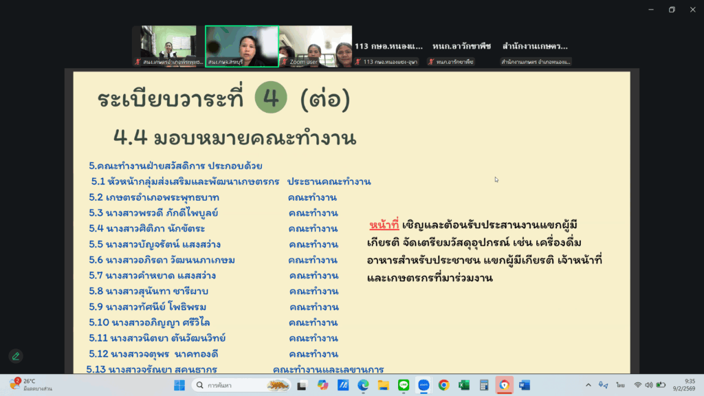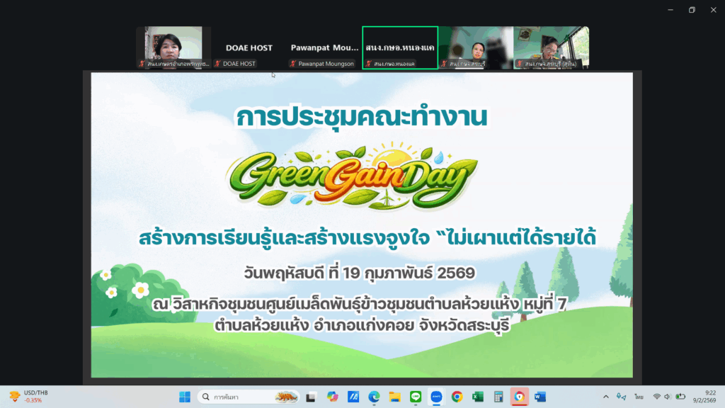 วันที่ 9 กุมภาพันธ์ 2569 เวลา 09.30 น. นางสาวสิริรัตน์ หินอ่อน เกษตรอำเภอวิหารแดง รักษาราชการแทน เกษตรอำเภอพระพุทธบาท พร้อมด้วย เจ้าหน้าที่สำนักงานเกษตรอำเภอพระพุทธบาท ร่วมประชุมคณะทำงานจัดงานโครงการเป็นมิตรกับสิ่งแวดล้อม “Green Gain Day” สร้างการเรียนรู้และสร้างแรงจูงใจ “ไม่เผาแต่ได้รายได้” ในวันพฤหัสบดีที่ 19 กุมภาพันธ์ 2569 ณ ณ วิสาหกิจชุมชนศูนย์เมล็ดพันธ์ข้าวชุมชนตำบลห้วยแห้ง อำเภอแก่งคอย จังหวัดสระบุรี ผ่านระบบ Zoom Meeting ณ สำนักงานเกษตรอำเภอพระพุทธบาท จังหวัดสระบุรี โดยมีวัตถุประสงค์เพื่อชี้แจง และวางแผนการดำเนินงานการจัดงานจัดงานโครงการเป็นมิตรกับสิ่งแวดล้อม “Green Gain Day” สร้างการเรียนรู้และสร้างแรงจูงใจ “ไม่เผาแต่ได้รายได้”